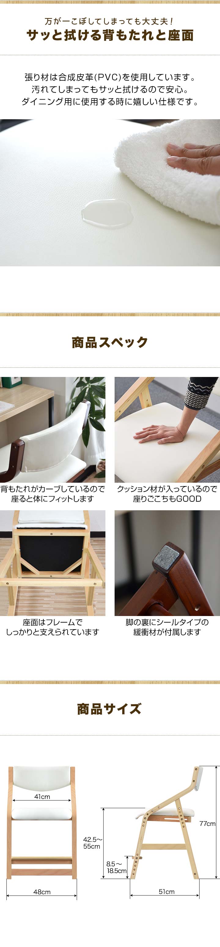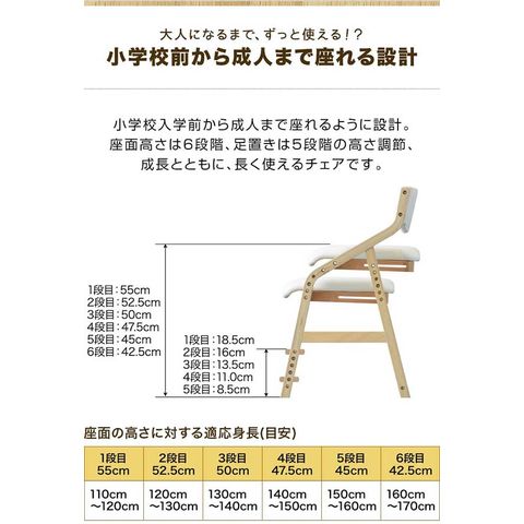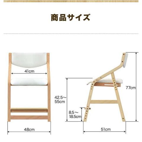 | サイズ: (約)48cm×51cm×77cm 座面の高さ: (約)42.5cm / 45cm / 47.5cm / 50cm / 52.5cm / 55cm (6段階調節) 足置きの高さ: (約)8.5cm / 11cm / 13.5cm / 16cm / 18.5cm (5段階調節) |