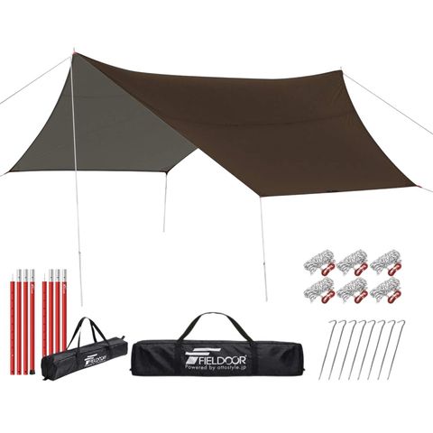 FIELDOOR タープテント ヘキサタープ (ダークブラウン:標準/本体&アルミポール2組セット) 大型 Mサイズ 4.4m×4.7m 4~6人用 日よけ 六角形 UVカット 高耐水 簡易テント サンシェード オーニング コンパクト アウトドア BBQ キャンプ 送料無料