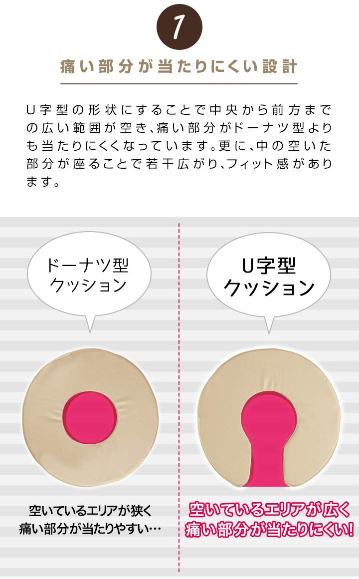 痛い部分が当たりにくい設計 U字型の形状にすることで中央から前方までの広い範囲が空き、痛い部分がドーナツ型よりも当たりにくくなっています。更に、中の空いた部分が座ることで若干広がり、フィット感があります。
