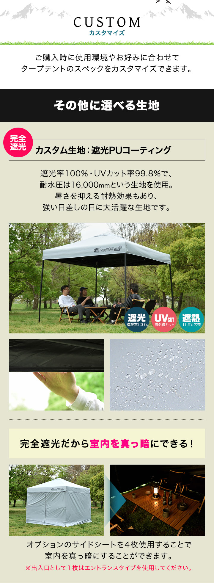 | 耐水圧: 2,000mm以上 遮光PUコーティング:16,000mm |