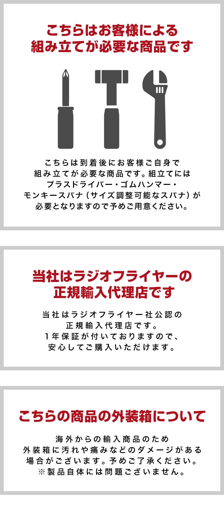 | 特記事項: ・こちらの商品は組み立てが必要な商品です。 ※工具は付属しません。 ・ネジなど部品が余る場合がございますのでご了承ください。 ・タイヤなど部品で固定する際は、完全に固定してください。 |