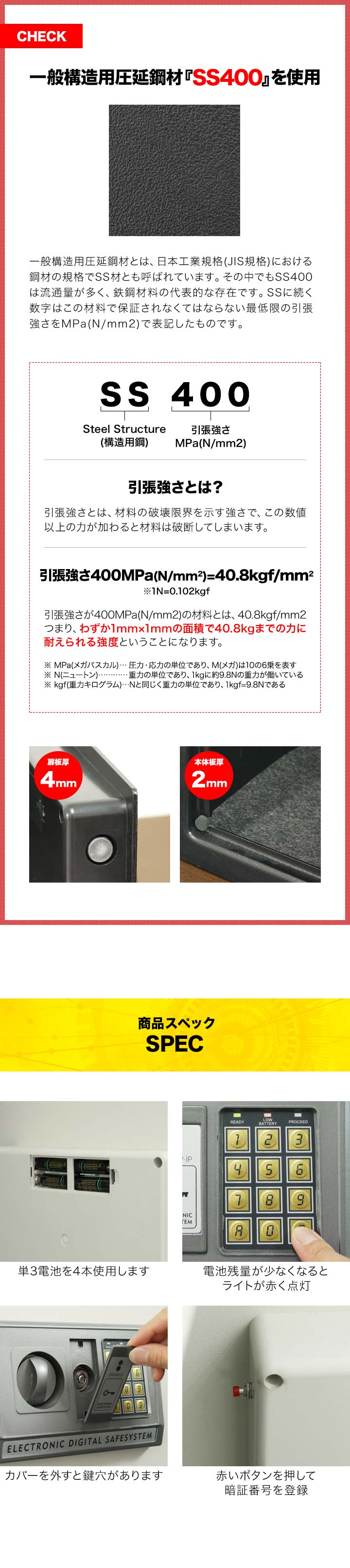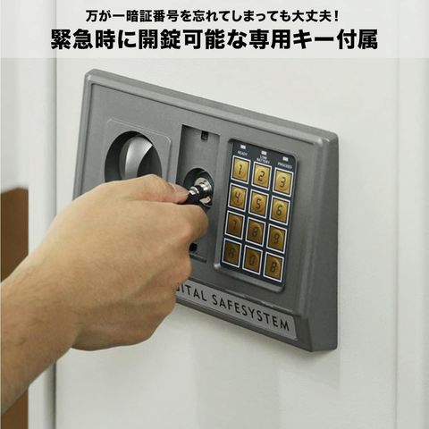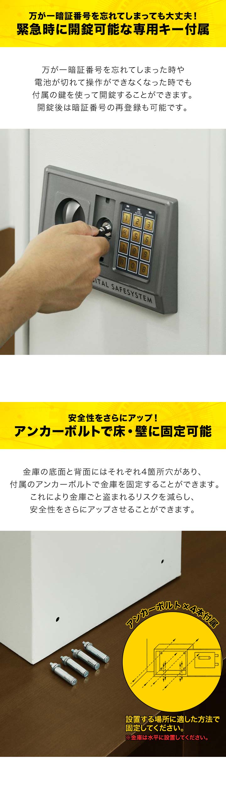 | 特記事項: こちらの金庫は、暗証番号の入力を3回間違えると盗難防止機能によりロックがかかり、操作パネルが反応しなくなります。 ※解除方法は説明書に記載。 |