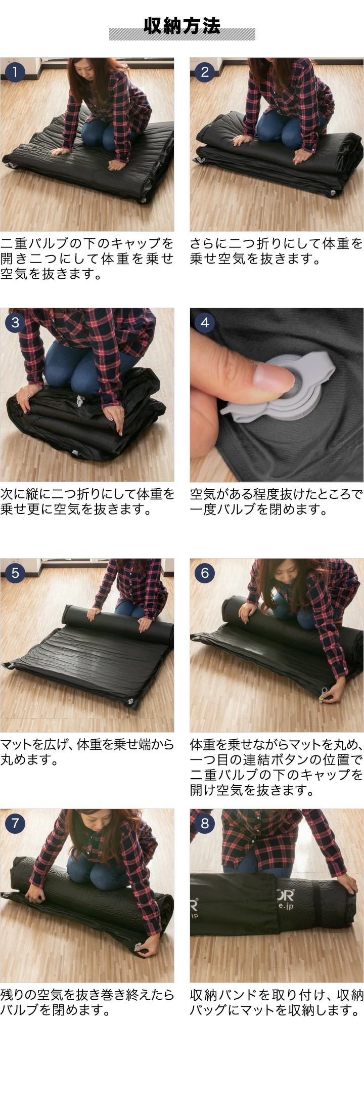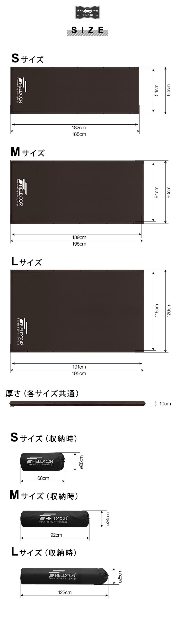| サイズ: 【Sサイズ】 本体サイズ : (約)60cm×188cm×10cm ※収納時 : (約)φ28cm×68cm ウレタンサイズ : (約)54cm×182cm×10cm 【Mサイズ】 本体サイズ : (約)90cm×195cm×10cm ※収納時 : (約)φ24cm×92cm ウレタンサイズ : (約)84cm×189cm×10cm 【Lサイズ】 本体サイズ : (約)120cm×191cm×10cm ※収納時 : (約)φ25cm×122cm ウレタンサイズ : (約)116cm×195cm×10cm |