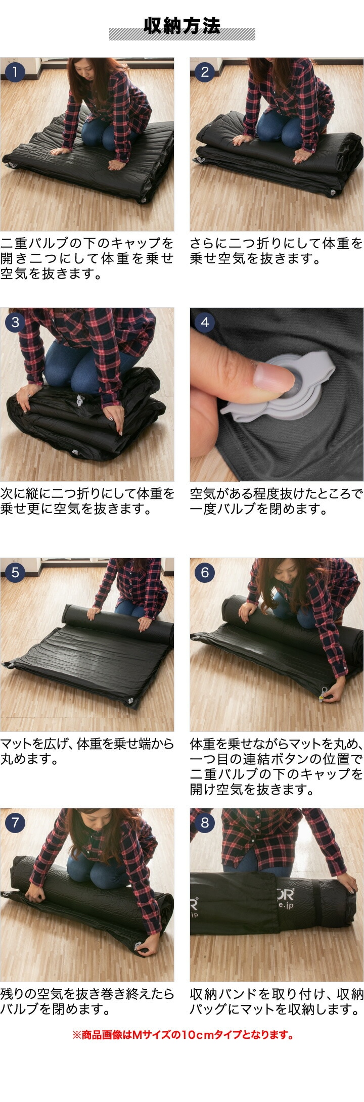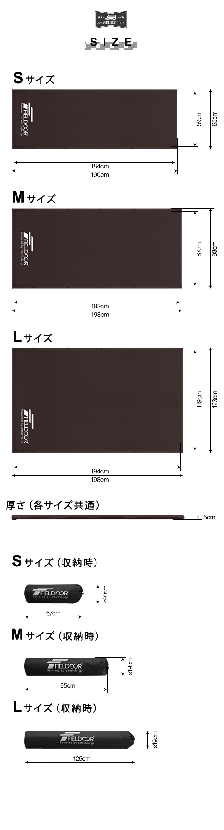| サイズ: 【Sサイズ】 本体サイズ : (約)65cm×190cm×5cm ※収納時 : (約)φ20cm×67cm ウレタンサイズ : (約)59cm×184cm×5cm 【Mサイズ】 本体サイズ : (約)93cm×198cm×5cm ※収納時 : (約)φ19cm×95cm ウレタンサイズ : (約)87cm×192cm×5cm 【Lサイズ】 本体サイズ : (約)123cm×194cm×5cm ※収納時 : (約)φ19cm×125cm ウレタンサイズ : (約)119cm×198cm×5cm |