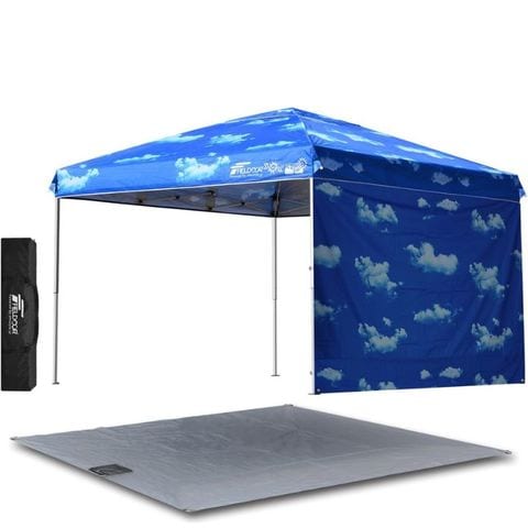 FIELDOOR ワンタッチタープテント 3m (標準:ブルースカイ/スチール/4点脚ロック/グランドシート/サイドシート1枚付) テント タープ ワンタッチ ワンタッチテント ワンタッチタープ UV加工 撥水 ベンチレーション 収納バッグ付 日よけ キャンプ バーベキュー 送料無料