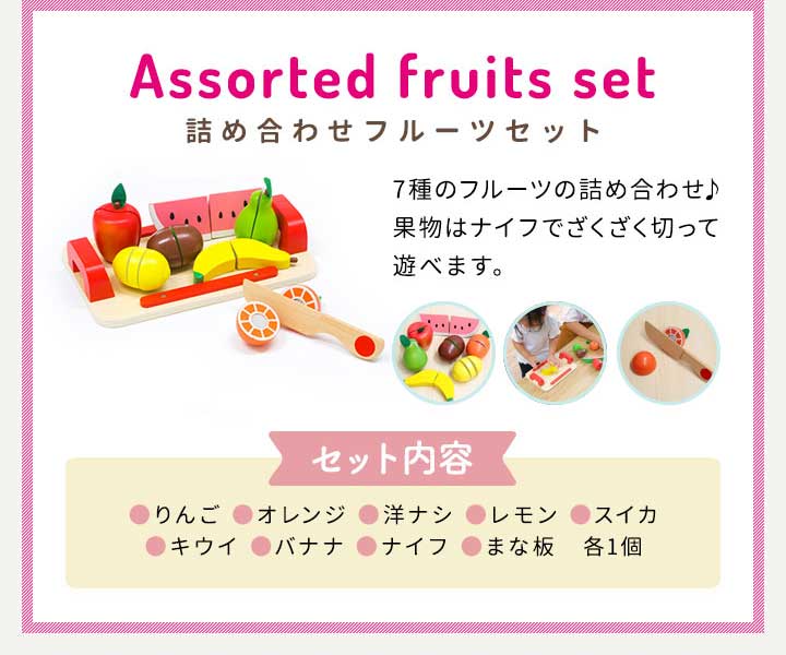 | セット内容: りんご・オレンジ・洋ナシ・レモン・スイカ・キウイ・バナナ・ナイフ・まな板 各1個 |