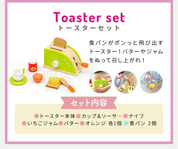 | セット内容: トースター本体・カップ&ソーサ―・ナイフ・いちごジャム・バター・オレンジ 各1個/食パン 2個 |