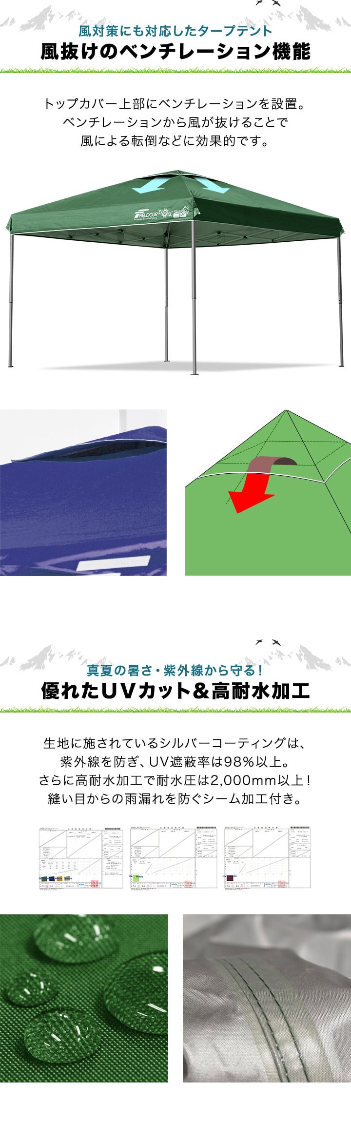 FIELDOOR ワンタッチタープテント 3m (標準:ブルー/アルミ/4点脚ロック/強化サポート/サイドシート1枚付) 軽量 テント タープ ワンタッチ ワンタッチテント ワンタッチタープ UV加工 撥水 ベンチレーション 収納バッグ付 日よけ キャンプ 送料無料