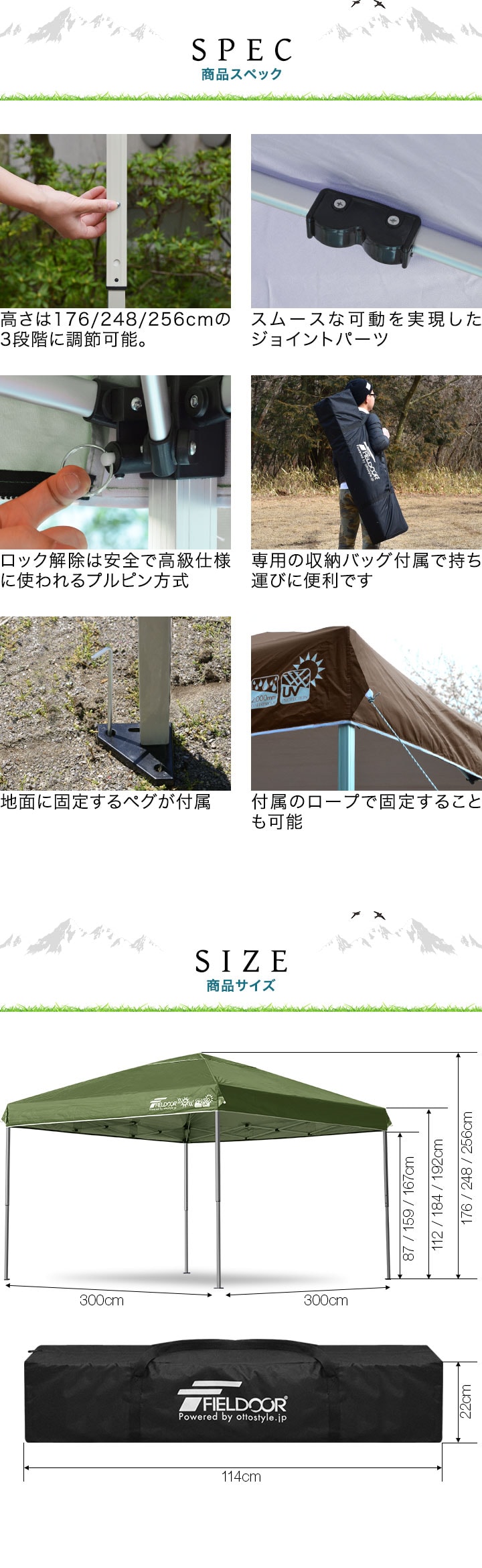 | サイズ: 組立時 : (約)3.0m×3.0m×1.76m / 2.48m / 2.56m 収納時 : (約)22cm×22cm×114cm |