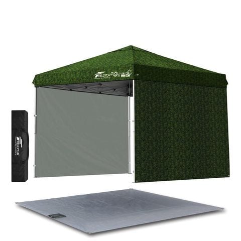 FIELDOOR ワンタッチタープテント 2.5m (標準:カモフラージュグリーン/スチール/4点脚ロック/グランドシート/サイドシート2枚付) テント タープ ワンタッチ ワンタッチテント ワンタッチタープ UV加工 撥水 ベンチレーション 収納バッグ付 日よけ キャンプ 送料無料