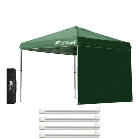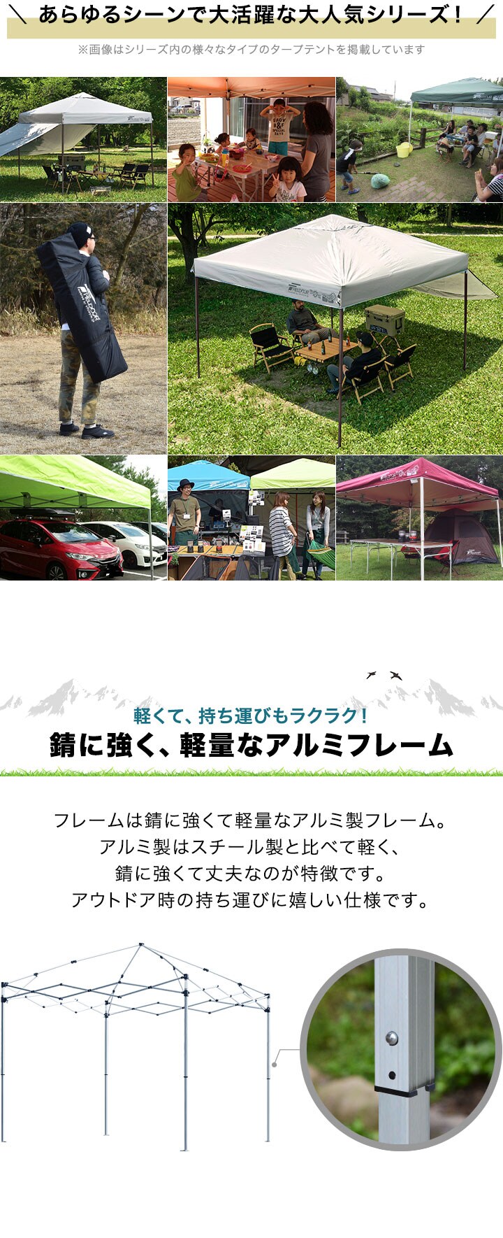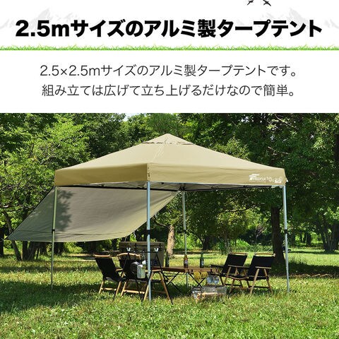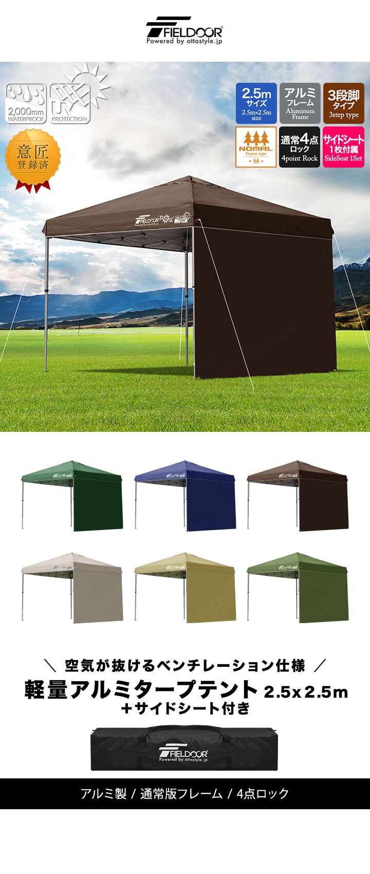 FIELDOOR ワンタッチタープテント 2.5m (標準:グリーン/アルミ/4点脚ロック/フレーム強化サポート/サイドシート1枚付) 軽量 テント タープ ワンタッチ ワンタッチテント ワンタッチタープ UV加工 撥水 ベンチレーション 収納バッグ付 日よけ キャンプ 送料無料
