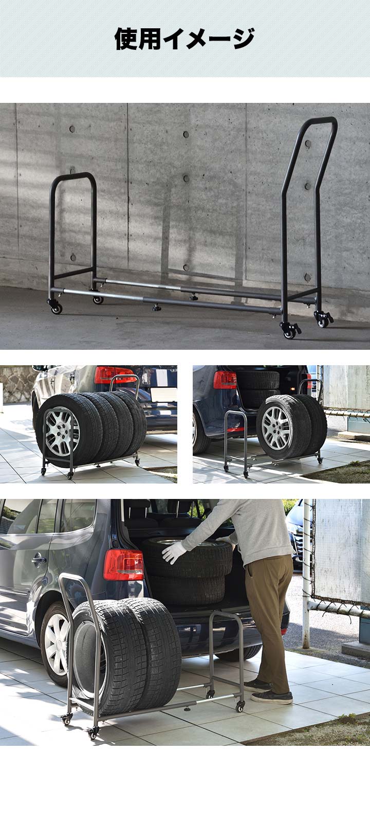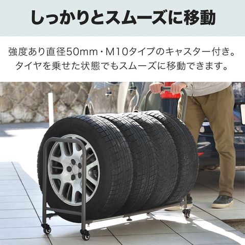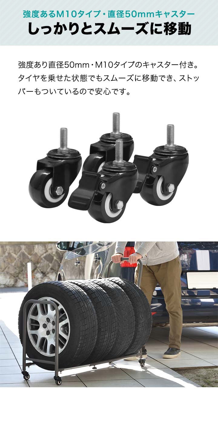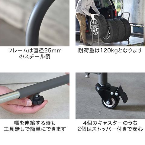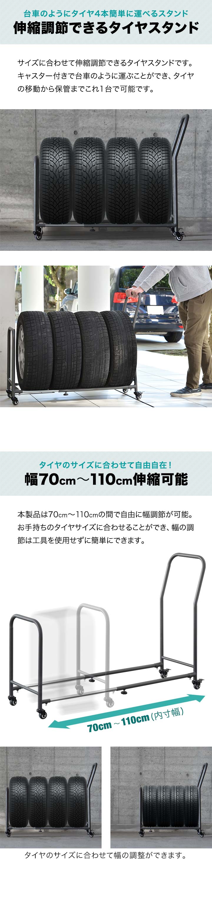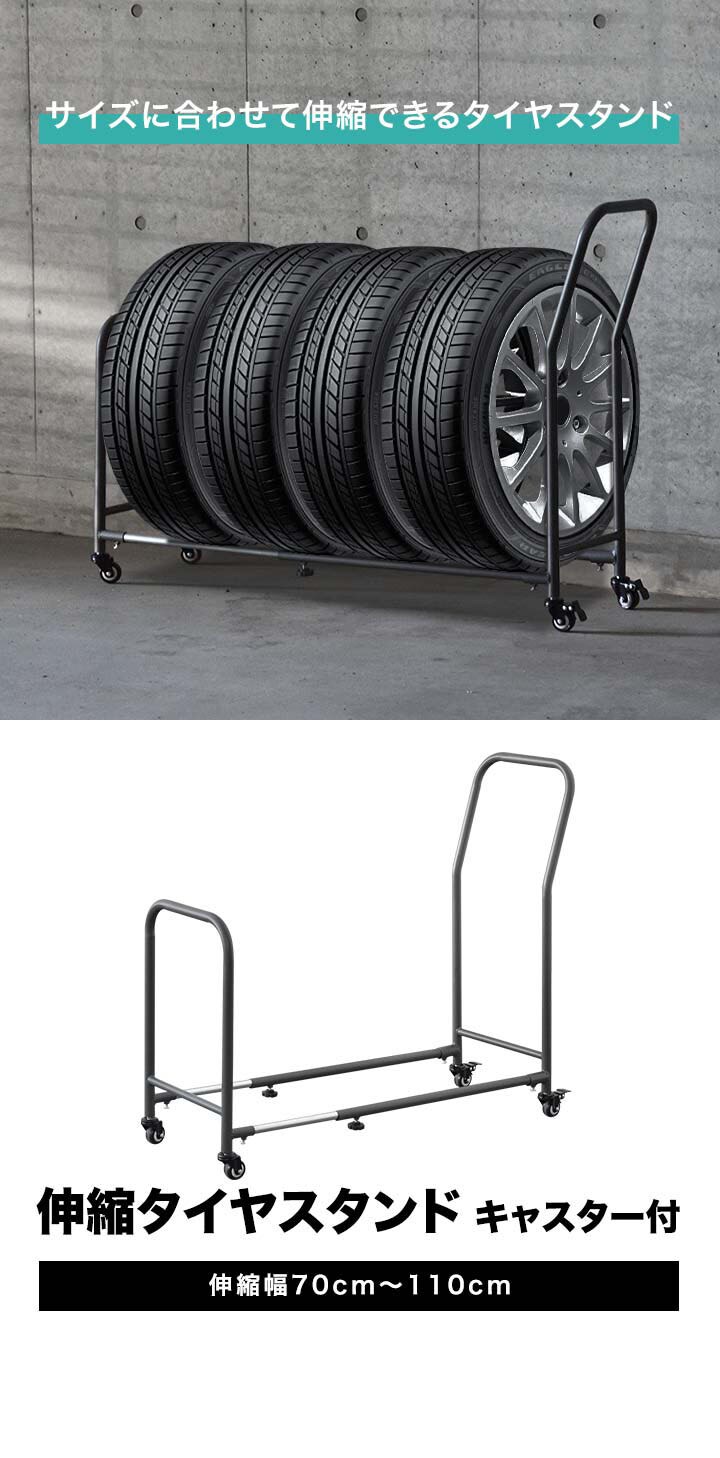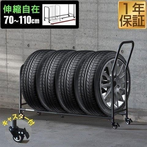 タイヤラック 4本 台車 (スタンド本体のみ) 伸縮式 70cm~110cm 移動式 タイヤキャリー サイズ調整 収納 台車 タイプ タイヤスタンド タイヤ収納ラック タイヤキャリー タイヤ収納 タイヤ保管 夏用 冬用 スタッドレスタイヤ 保管 物置 送料無料