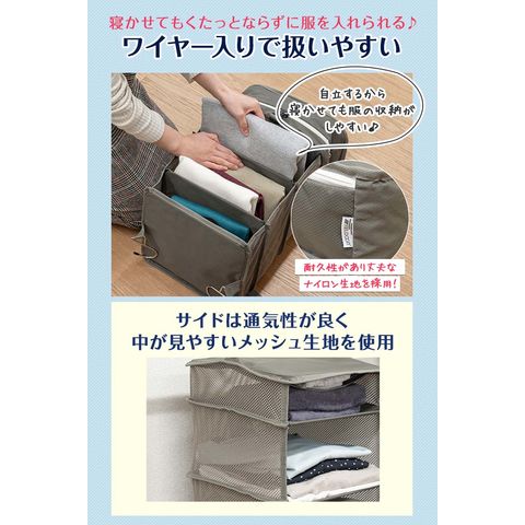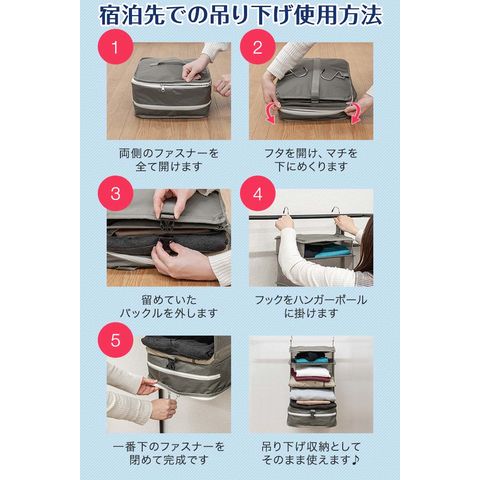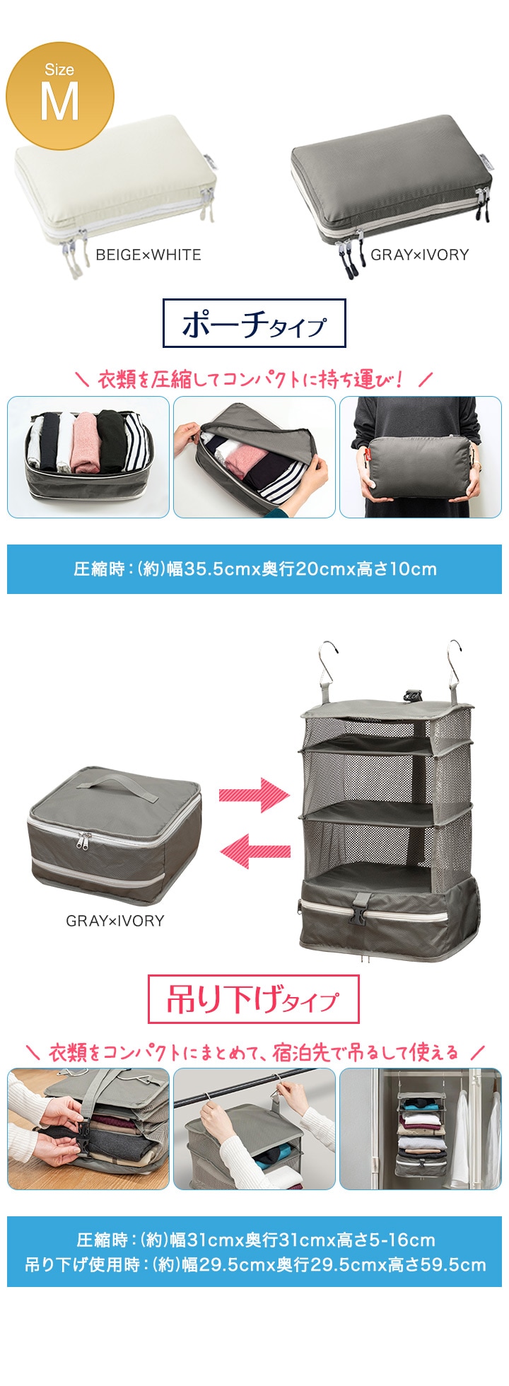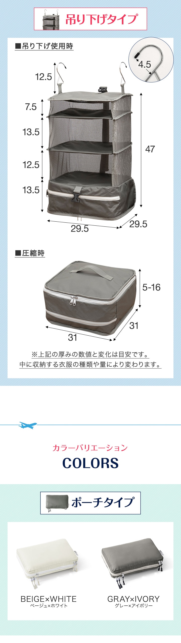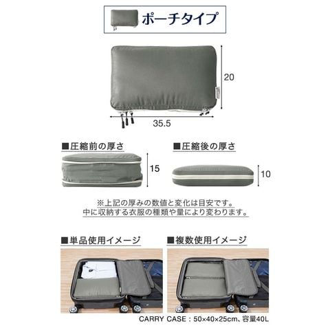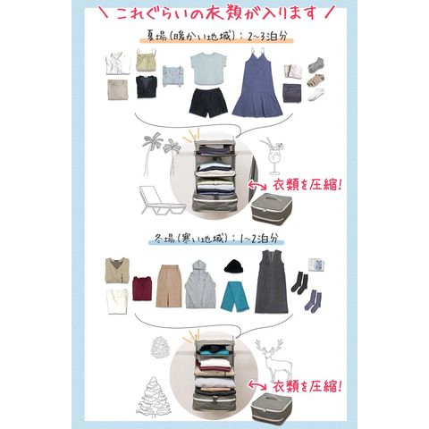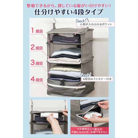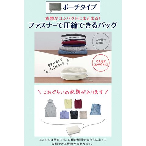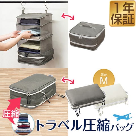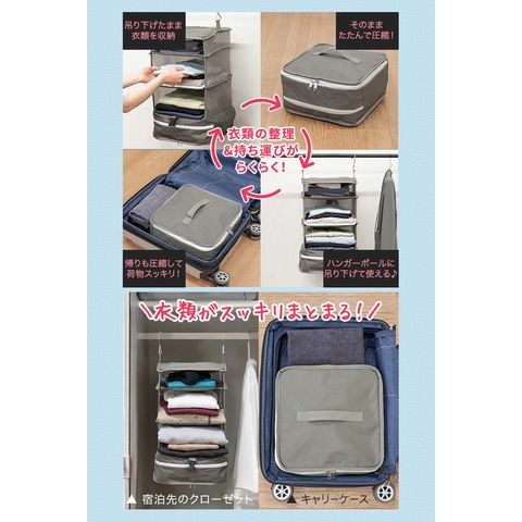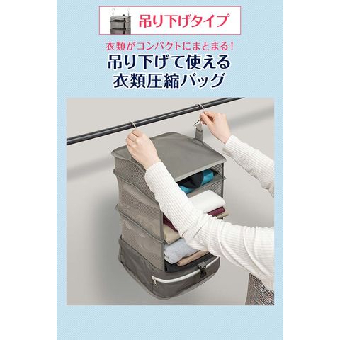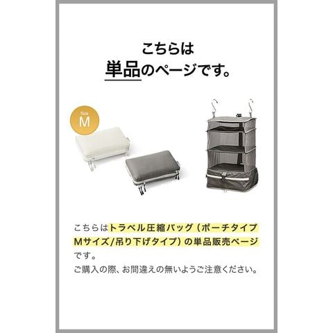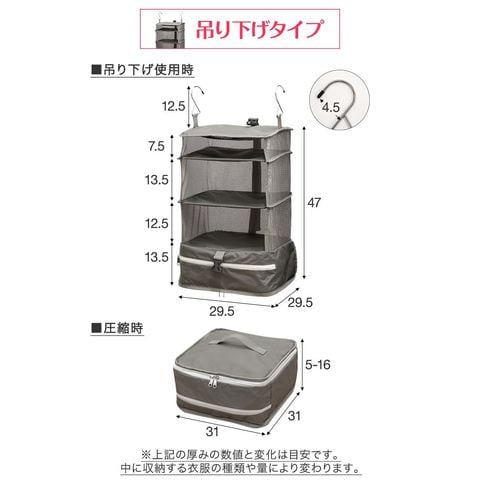 | サイズ: 【ポーチ型】 (約)幅35.5cm×奥行き20cm×高さ10~15cm 【吊り下げタイプ】 吊り下げ使用時:(約)幅29.5cmx奥行29.5cmx高さ59.5cm 圧縮時:(約)幅31cmx奥行31cmx高さ5-16cm ※収納する衣類の厚みや量によって変動します。 |