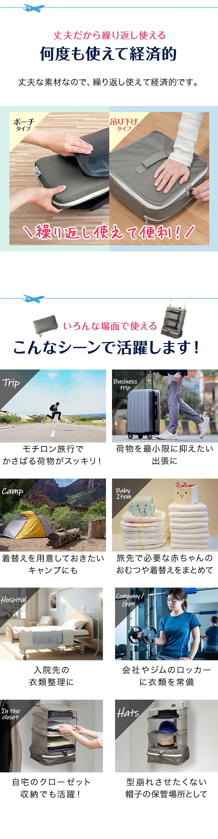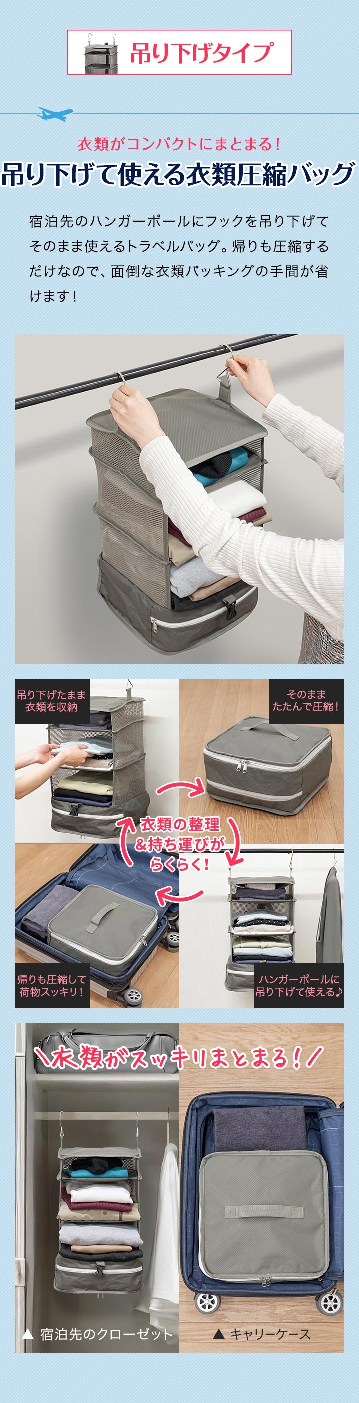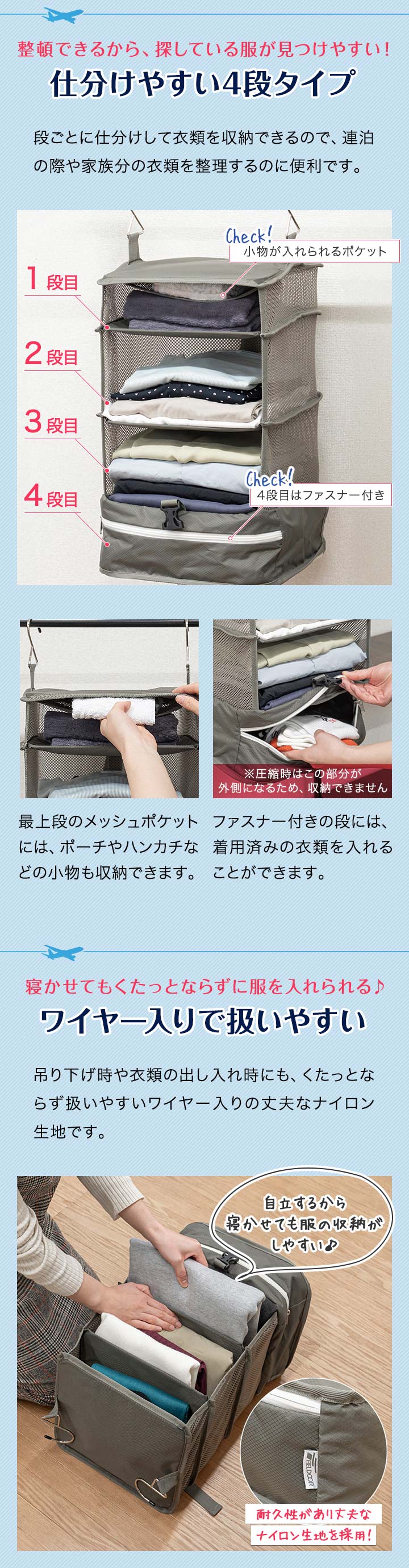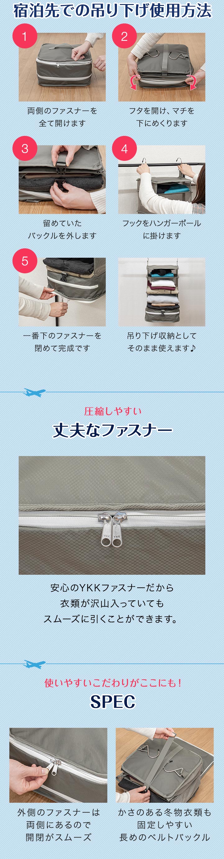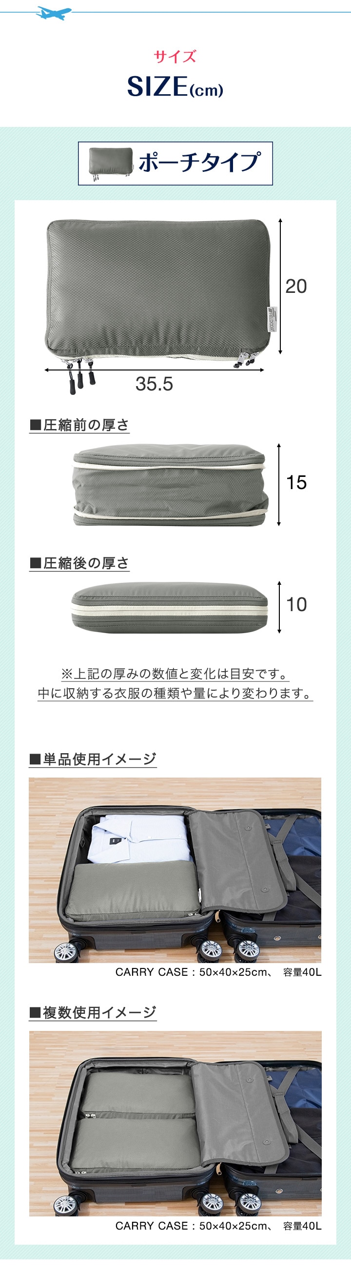 | サイズ: 【ポーチ型】 (約)幅35.5cm×奥行き20cm×高さ10~15cm 【吊り下げタイプ】 吊り下げ使用時:(約)幅29.5cmx奥行29.5cmx高さ59.5cm 圧縮時:(約)幅31cmx奥行31cmx高さ5-16cm ※収納する衣類の厚みや量によって変動します。 |