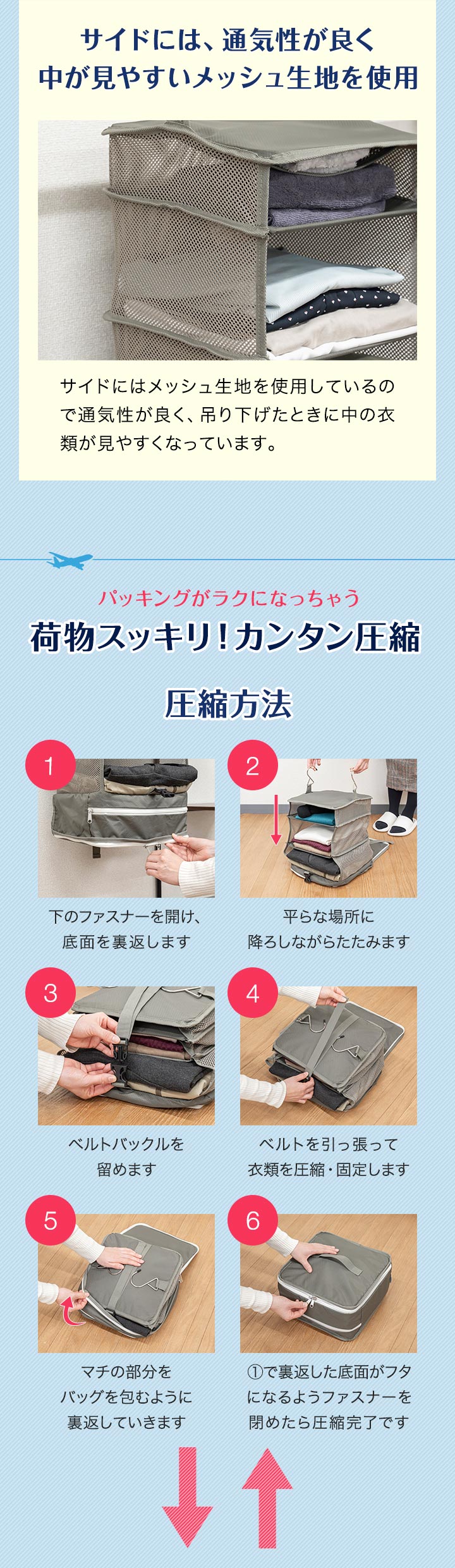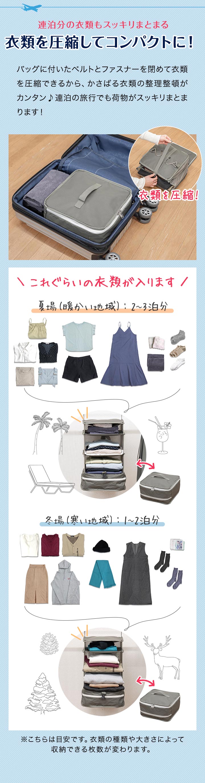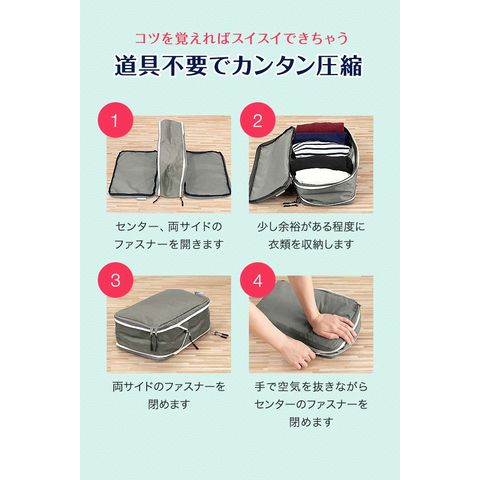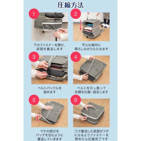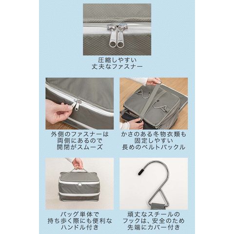 | 特記事項: ・高温多湿や、火の元に近い場所で使用及び保管はしないでください。 ・圧縮する際に、本製品に対して無理な力を加えないでください。破損の原因になります。 ・シワや型崩れが気になるものは収納しないでください。 ・濡れたり汚れたりした場合は、乾いた布で乾拭きし、風通しの良い場所で乾燥させてください。 |