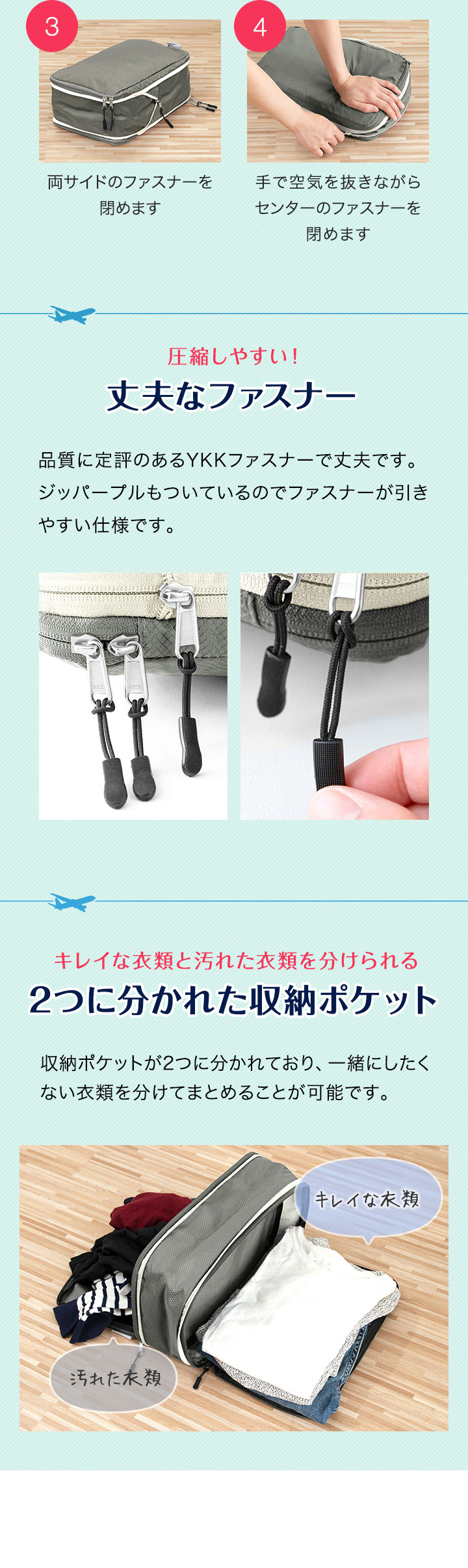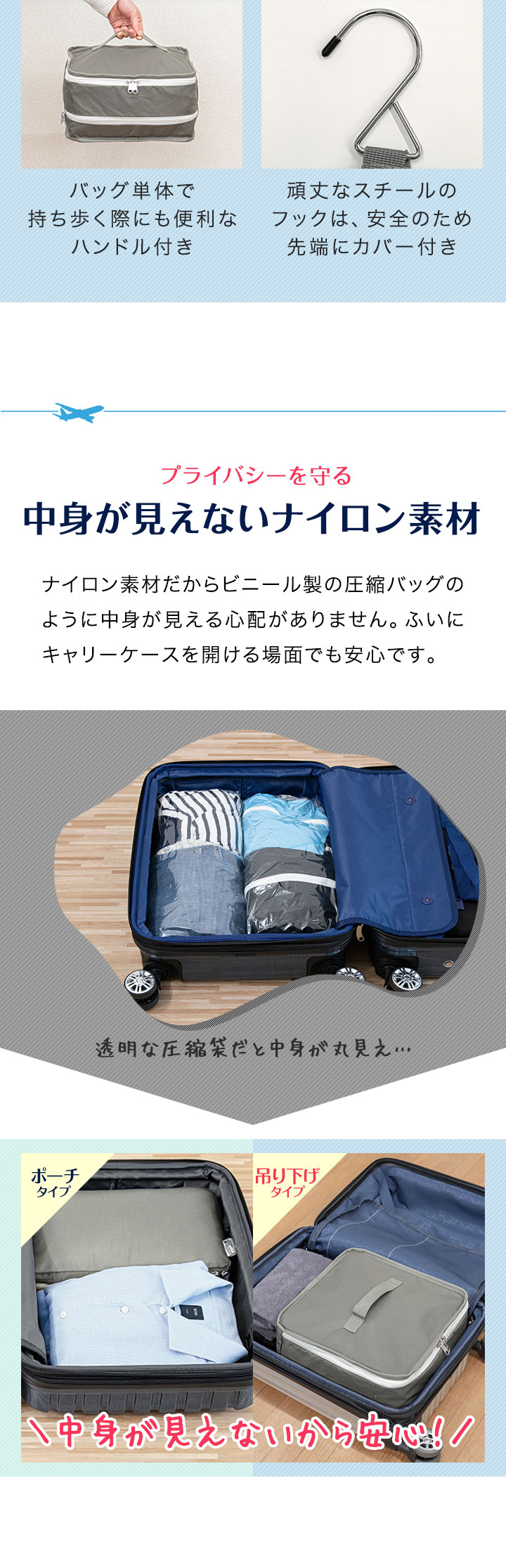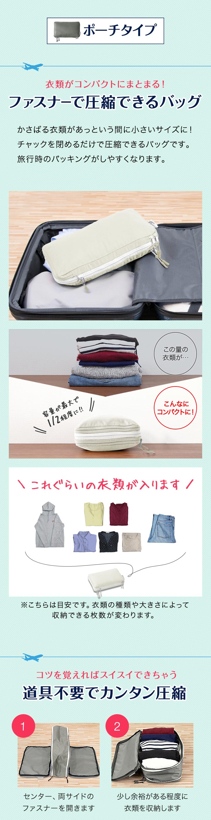 | 特記事項: ・高温多湿や、火の元に近い場所で使用及び保管はしないでください。 ・圧縮する際に、本製品に対して無理な力を加えないでください。破損の原因になります。 ・シワや型崩れが気になるものは収納しないでください。 ・濡れたり汚れたりした場合は、乾いた布で乾拭きし、風通しの良い場所で乾燥させてください。 |