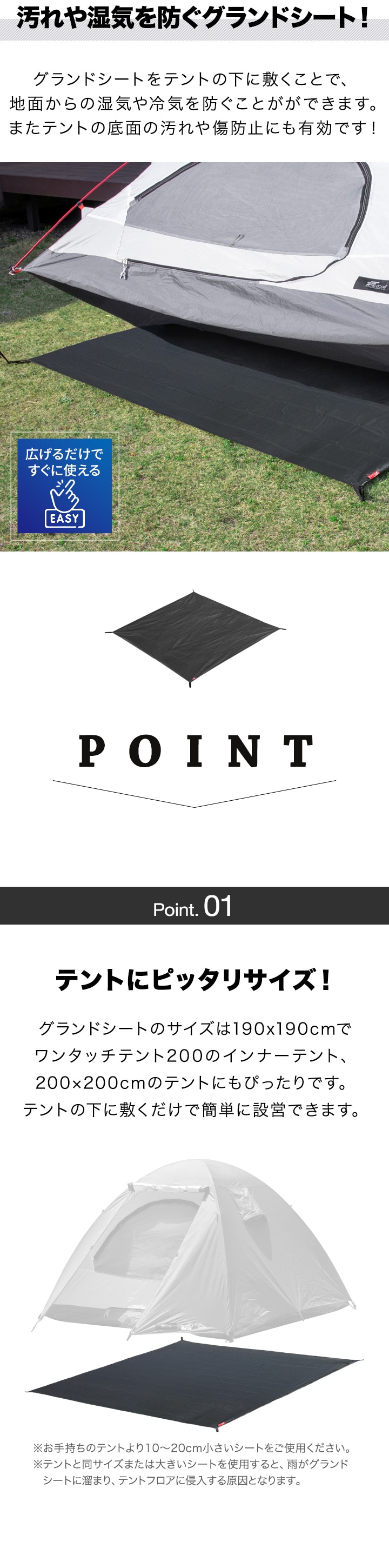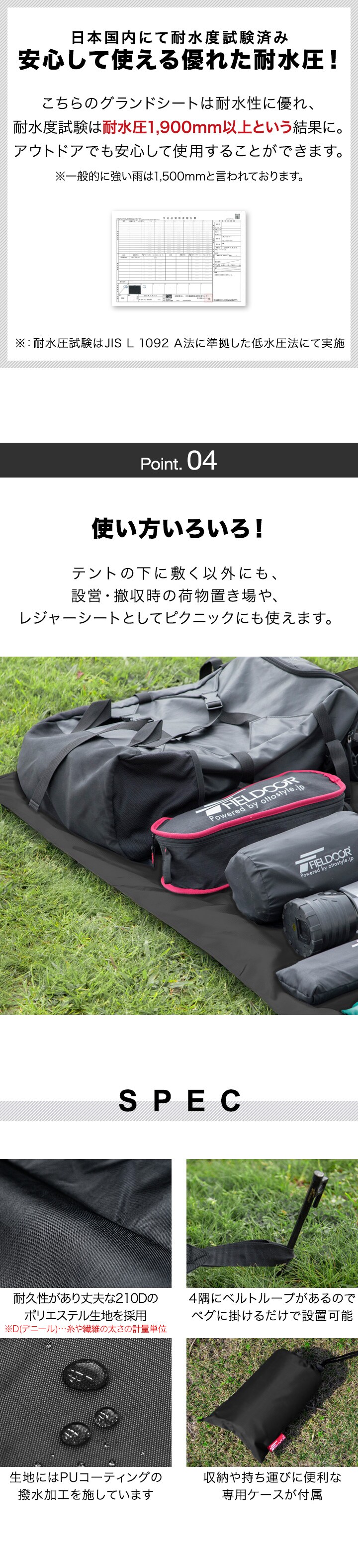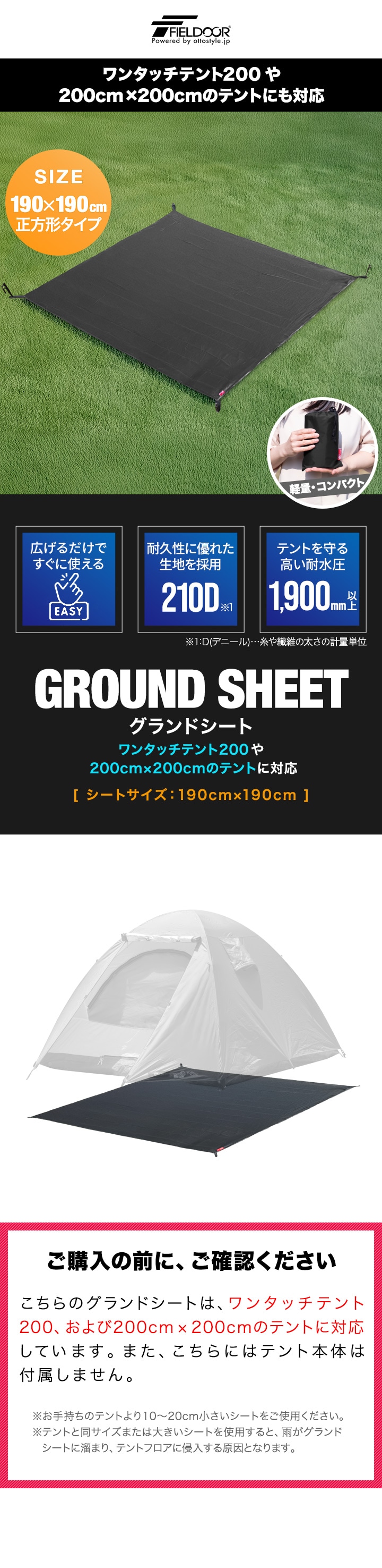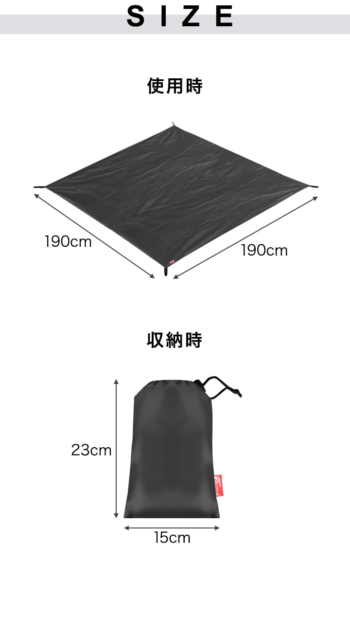 FIELDOOR グランドシート テントシート 190cm × 190cm 撥水加工 湿気防止 汚れ防止 キズ防止 テント用 レジャーシート テントマット おすすめ 軽量 コンパクト サイズ 190 正方形 必要 テントアクセサリー GROUND SHEET 送料無料