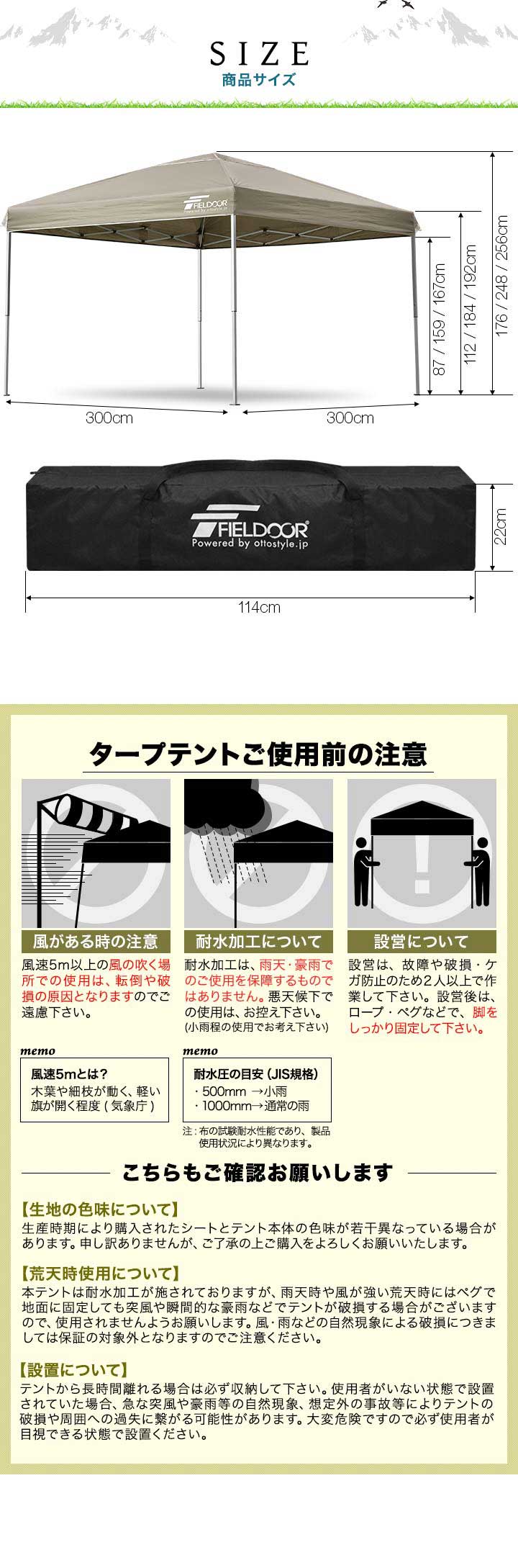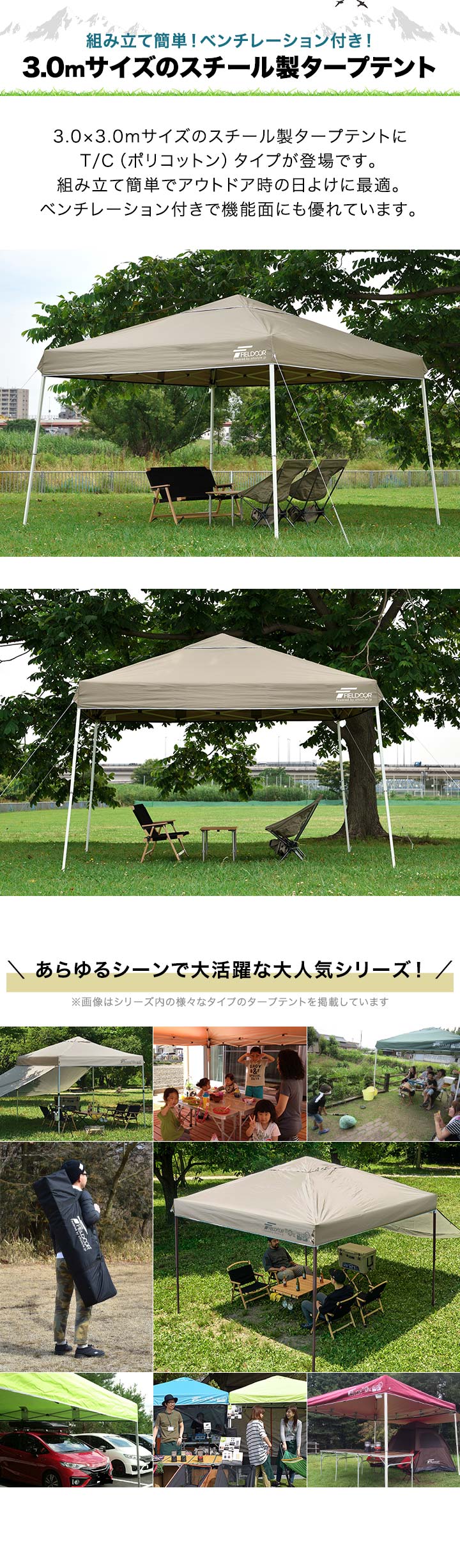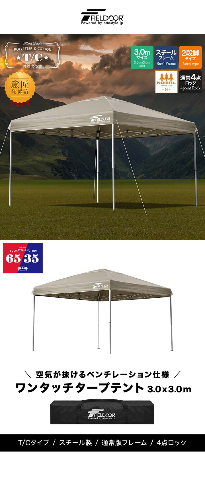 FIELDOOR ワンタッチタープテント 3m (難燃T/Cポリコットン/スチール/4点脚ロック/タープ本体のみ) テント タープ ワンタッチ ワンタッチテント ワンタッチタープ UV加工 撥水 ベンチレーション 収納バッグ付 日よけ キャンプ バーベキュー 送料無料