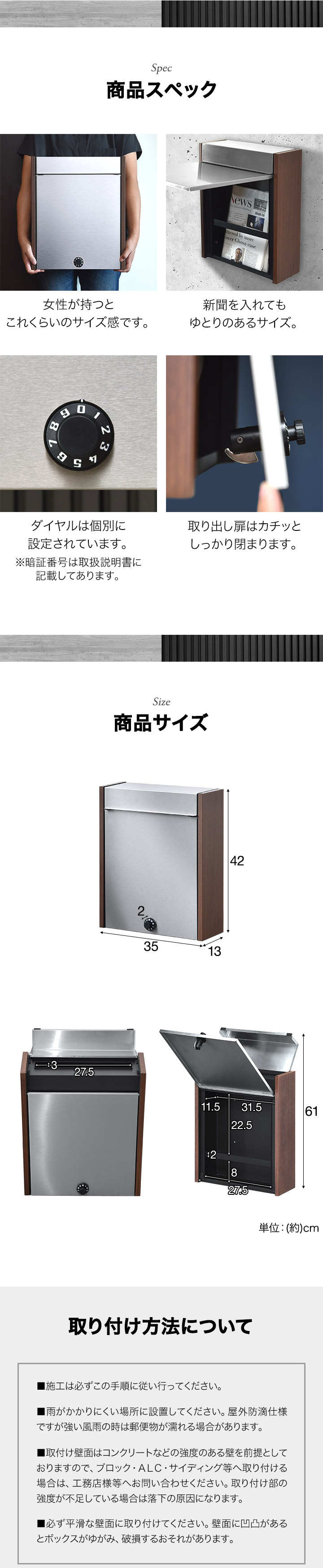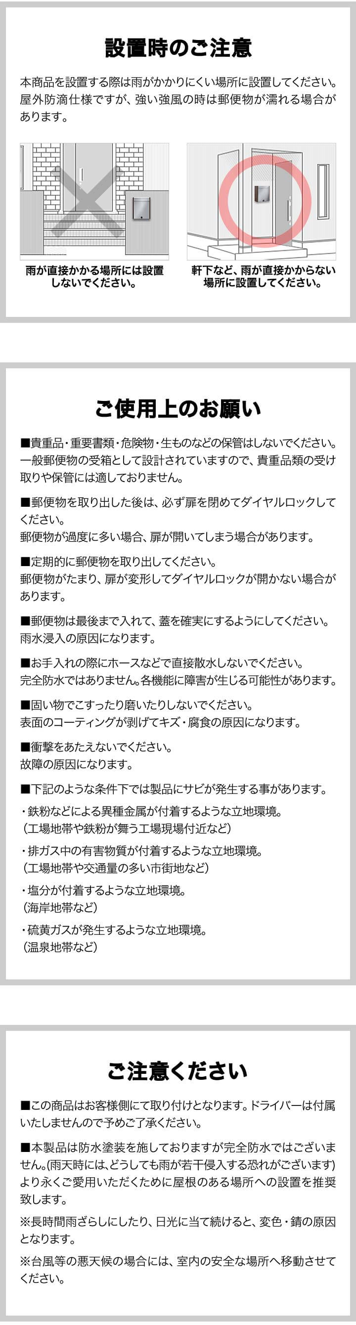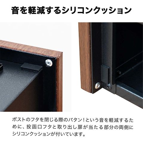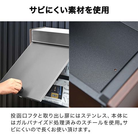 | 材質: 投函口フタ・取り出し扉:ステンレス 本体:スチール(ガルバナイズド処理) ※錆びの発生を抑えるガルバナイズド処理を施しています。 表面:粉体塗装 両側:木目調プリント |