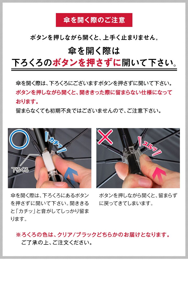 | 特記事項: ※商品の布地には撥水加工を施しておりますが、激しい雨の際は、雨水が傘生地にしみる事があります、ご了承ください。 また強風時は破損する恐れがありますので使用をお控えください。 ※雨天時の使用後は傘を広げて十分に湿気を取り除いてください。湿ったまま保管しますと、金属部分の錆の原因となります。 |