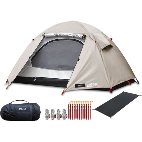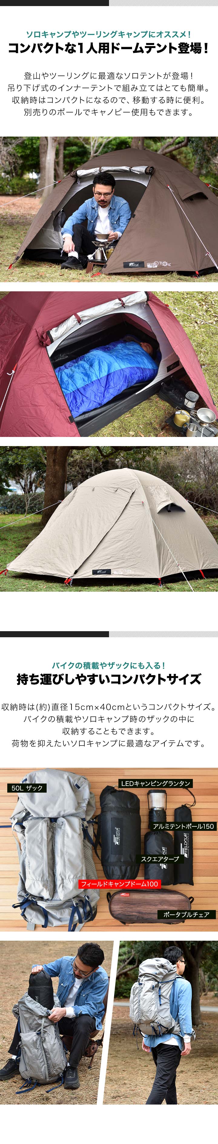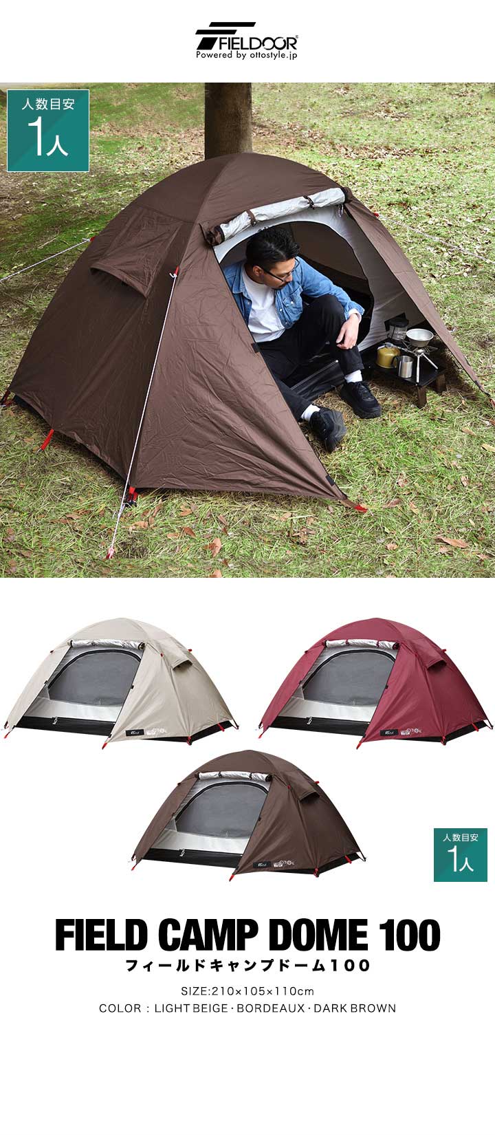 FIELDOOR テント ソロテント (ライトベージュ/本体&グランドシート) フィールドキャンプドーム 100 1人用 210x105cm ドームテント UVカット ドーム型 耐水圧 1,500mm以上 メッシュ フルクローズテント キャノピー インナーテント テントポール 簡易テント 送料無料