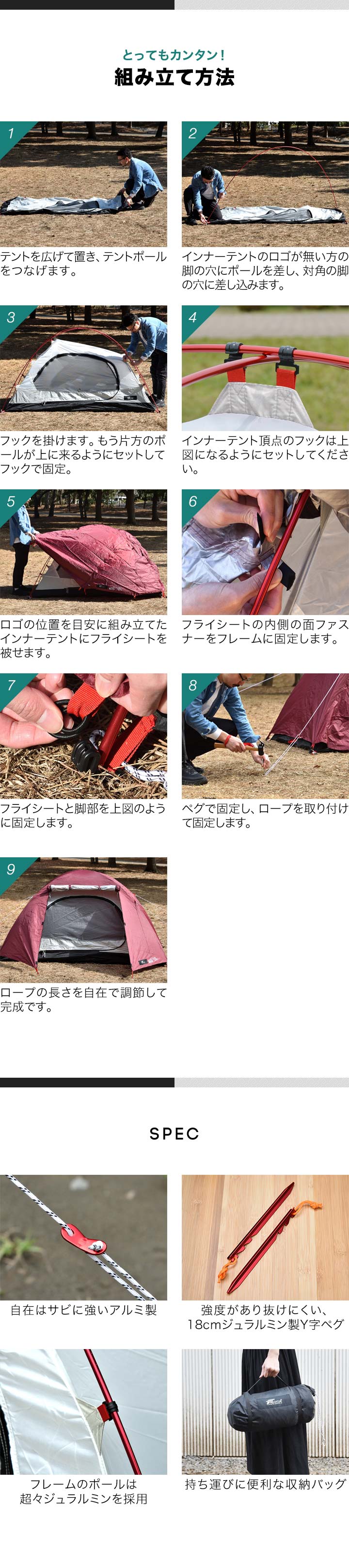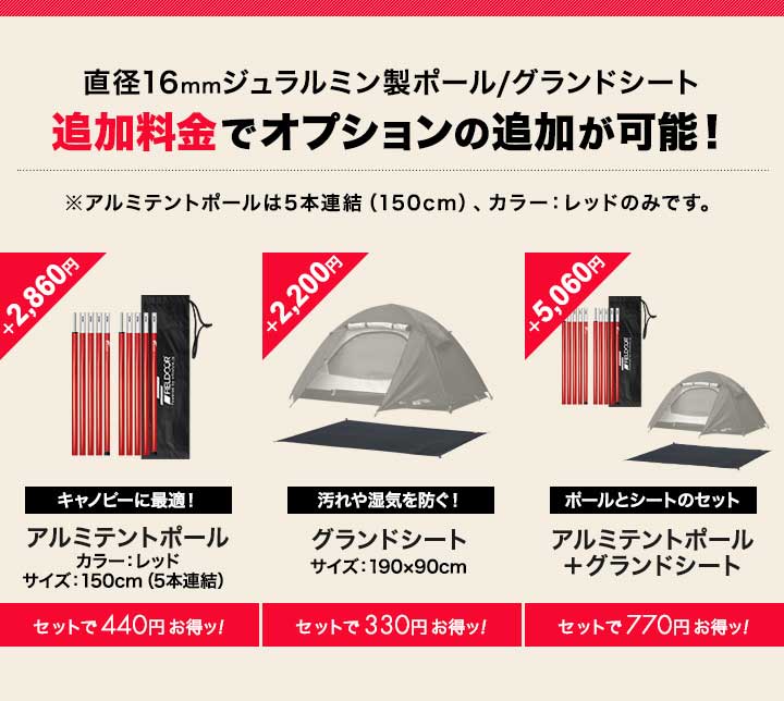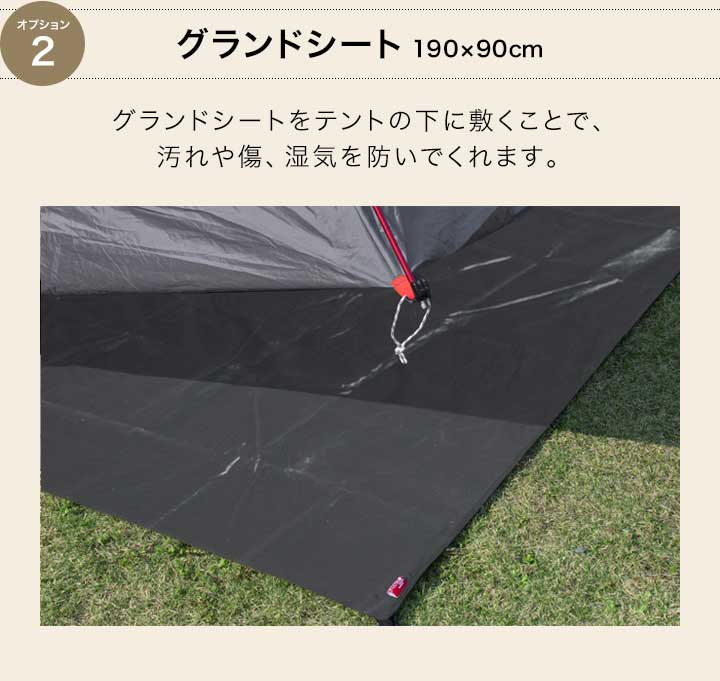 | 付属品: ・テント本体×1 ・フライシート×1 ・アルミテントポール×2 ・ペグ×13 ・ロープ×4 ・専用キャリーバッグ×1 ・取扱説明書(日本語) |