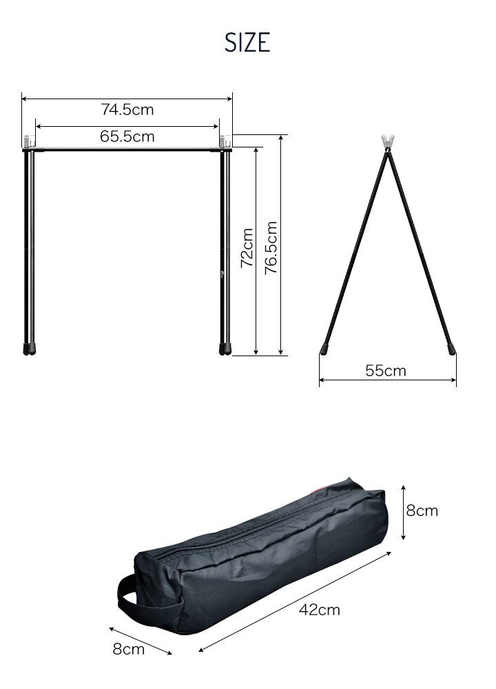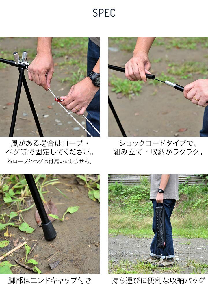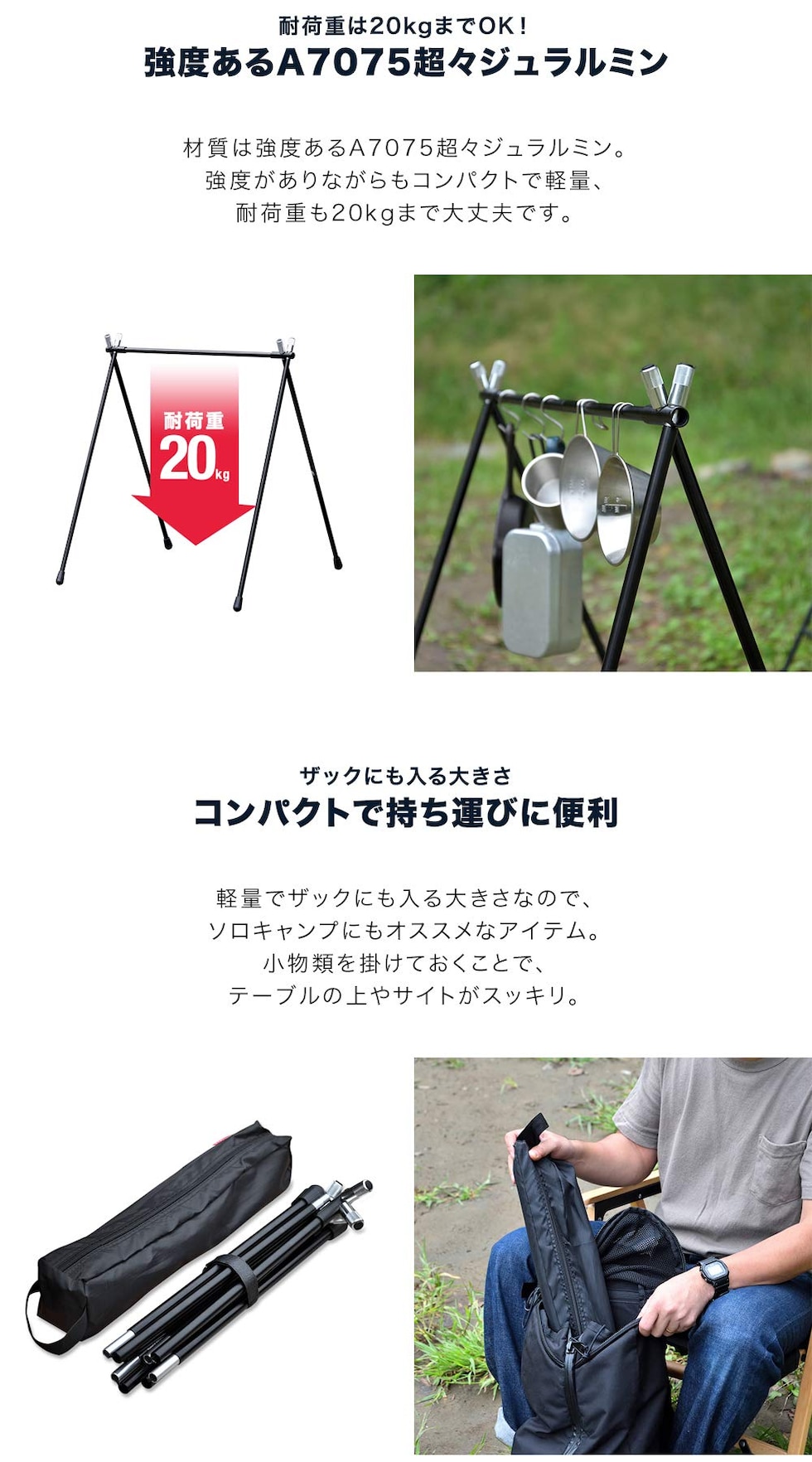 | 特記事項: ※本製品は焚き火用ハンガーではありません。火の近くでは使用しないでください。 ※こちらはハンガーラック本体のみです。フックやロープ・ペグ等は付属いたしません。 |
