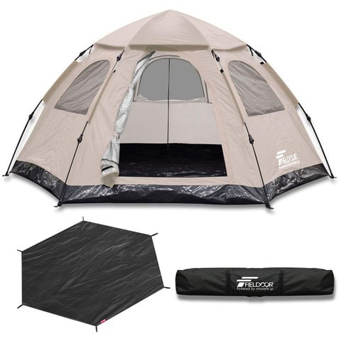 FIELDOOR テント ワンタッチ (ライトベージュ/テント本体&グランドシートセット) 4人用 5人用 ワンタッチテント UVカット 大型 ヘキサゴン 耐水圧 1,500mm以上 ドームテント キャンプテント ファミリー キャンプ用品 アウトドア セット 簡易テント 軽量 日よけ 送料無料