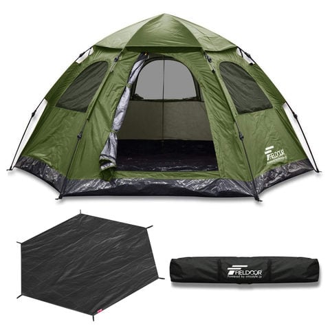 FIELDOOR テント ワンタッチ (カーキ/テント本体&グランドシートセット) 4人用 5人用 ワンタッチテント UVカット 大型 ヘキサゴン 耐水圧 1,500mm以上 ドームテント キャンプテント ファミリー キャンプ用品 アウトドア セット 簡易テント 軽量 日よけ キャンプ 送料無料