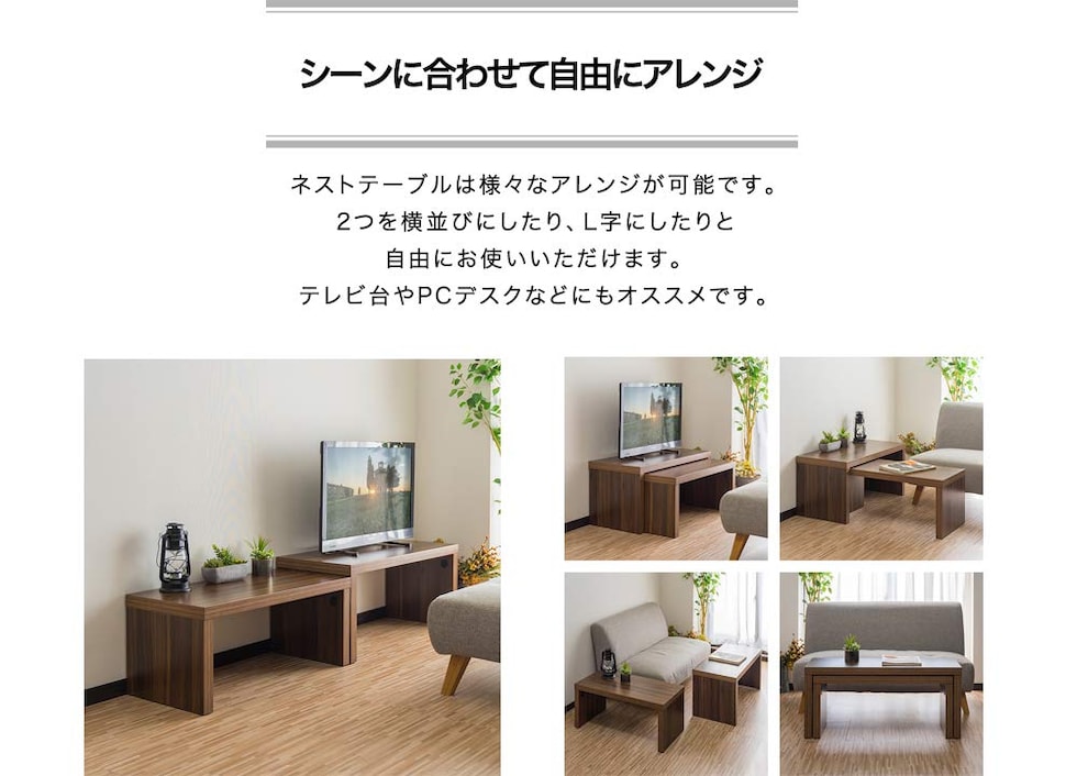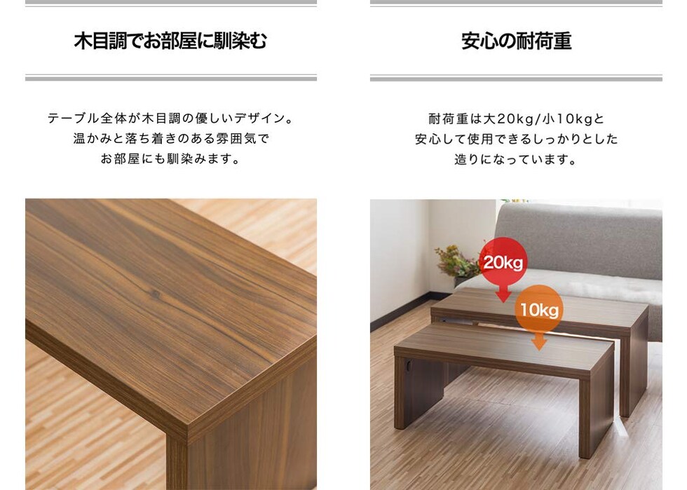 ネストテーブル ローテーブル 大小2点セット (ウォールナット) 幅90cm×奥行40cm スタッキングテーブル 収納 コの字 スライド 伸縮 木目調 送料無料