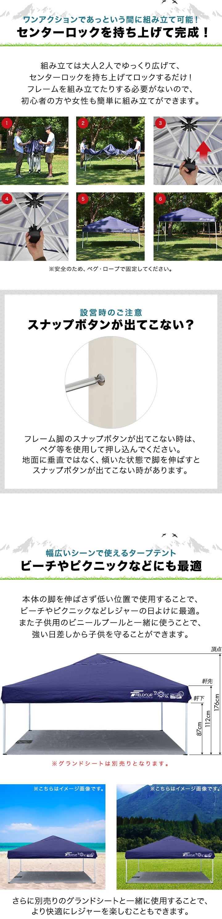 | 付属品: ・専用サイドシート(1枚) ・ロープ ・ペグ ・収納バッグ ・取扱説明書 |