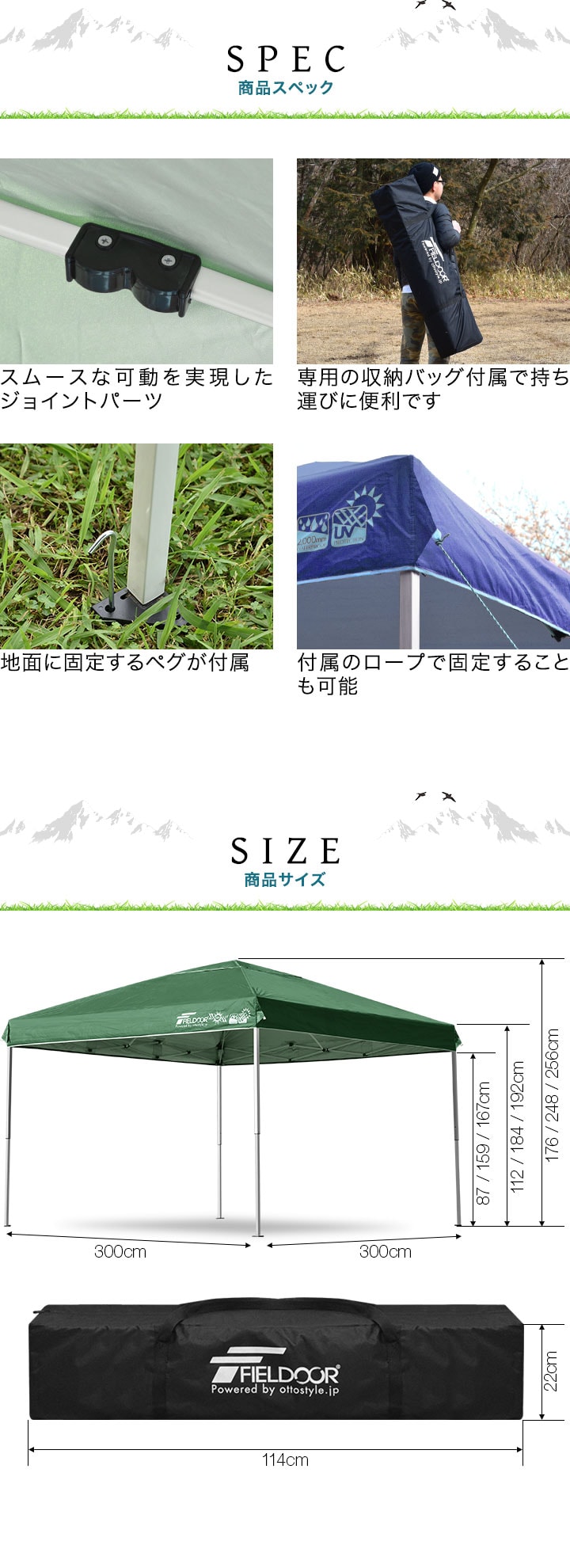 | サイズ: 組立時 : (約)3.0m×3.0m×1.76m / 2.48m / 2.56m 収納時 : (約)22cm×22cm×114cm |
