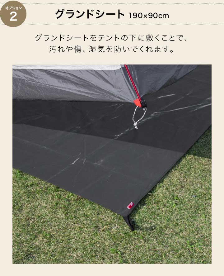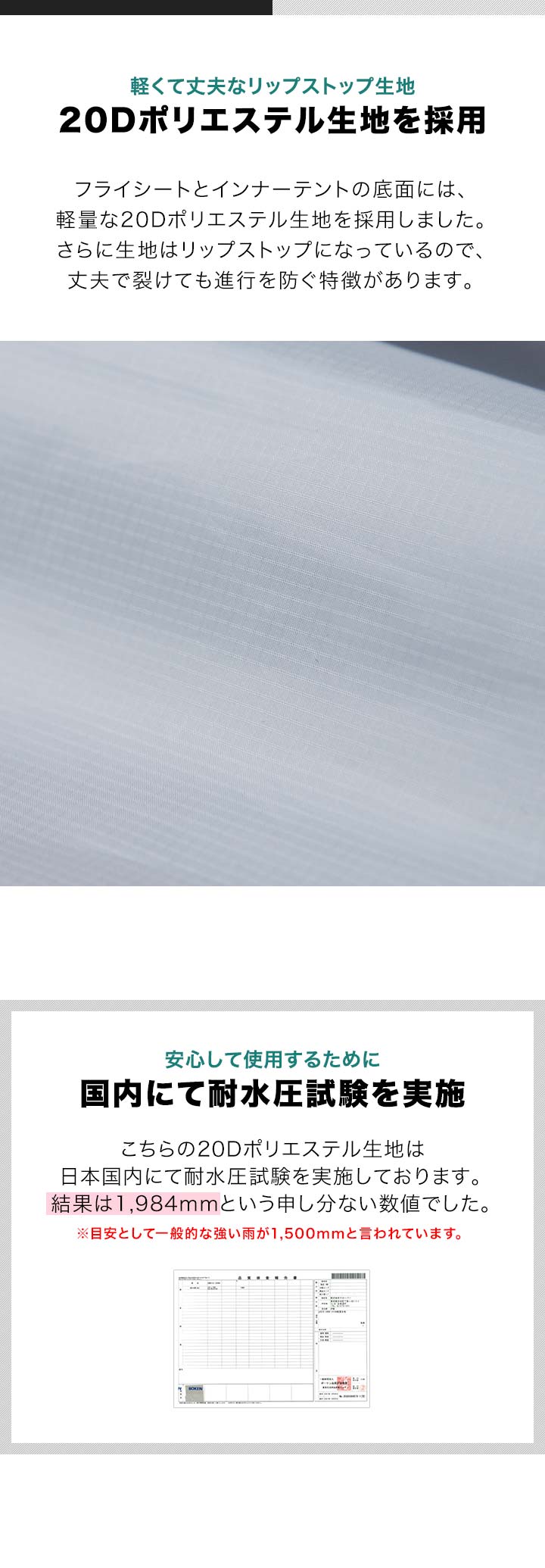| 材質: ・フライシート : 20D リップストップ ポリエステル ・インナーテント: ポリエステル ・グラウンド : 20D リップストップ ポリエステル ・ポール : 超々ジュラルミン (A7075系) ・ペグ : 超々ジュラルミン (A7075系) |
