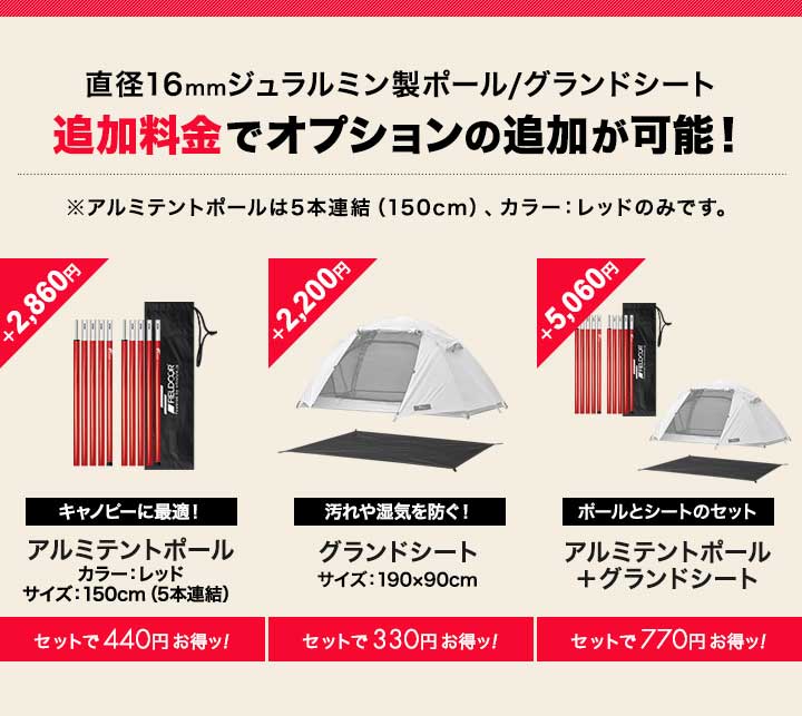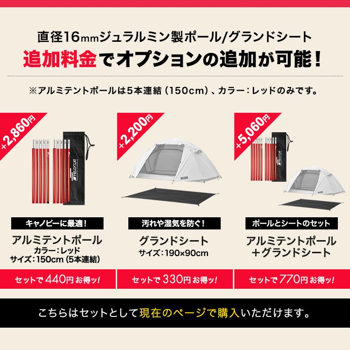 | 付属品: ・テント本体×1 ・フライシート×1 ・アルミテントポール×2 ・ペグ×13 ・ロープ×4 ・専用キャリーバッグ×1 ・取扱説明書(日本語) |
