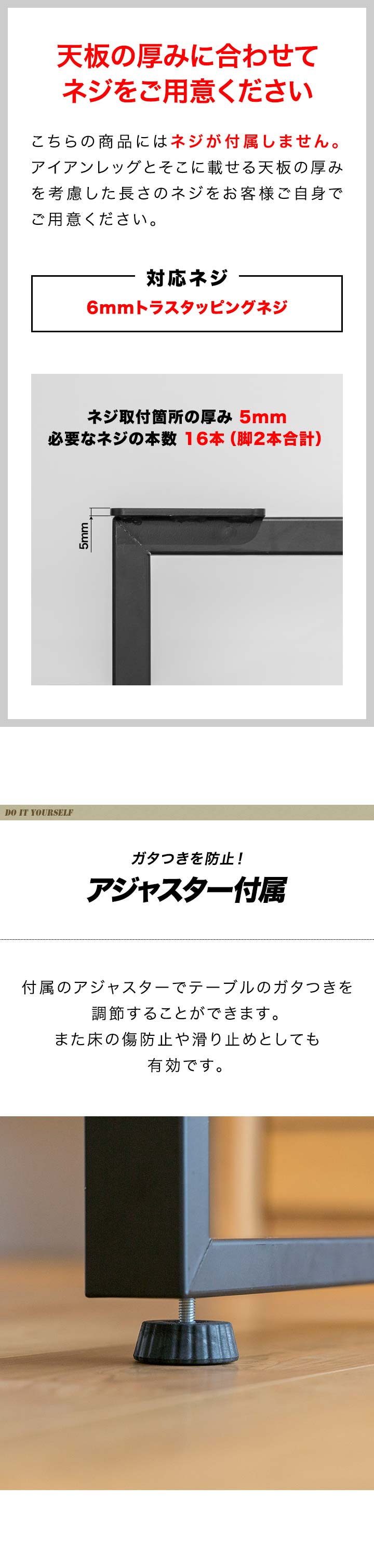| 特記事項: ※天板・ネジは付属しません。 ※本製品とそこに載せる天板の厚みを考慮した長さのネジをご用意ください。 ※天板に下穴を開けてからネジを取り付けてください。 ※天板の素材や大きさ・厚み等によって耐荷重は異なります。 |