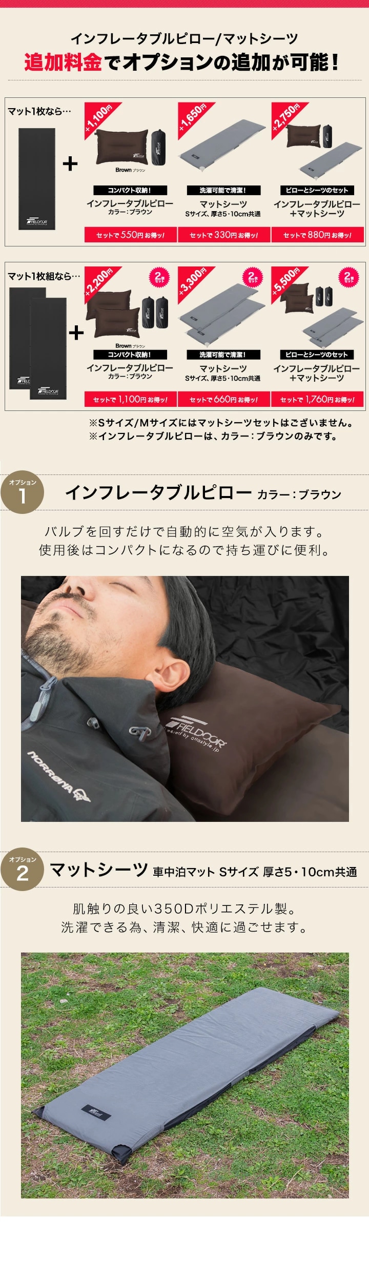 FIELDOOR 車中泊マット 10cm厚 (Sサイズ:幅60×長さ188cm/カーキ/マット1枚、枕&シーツ×各1点つき) 段差解消 連結 自動膨張 高密度ウレタン インフレータブル キャンプマット エアーマット エアマット エアーベッド エアベッド おすすめ アウトドア 寝具 防災 送料無料