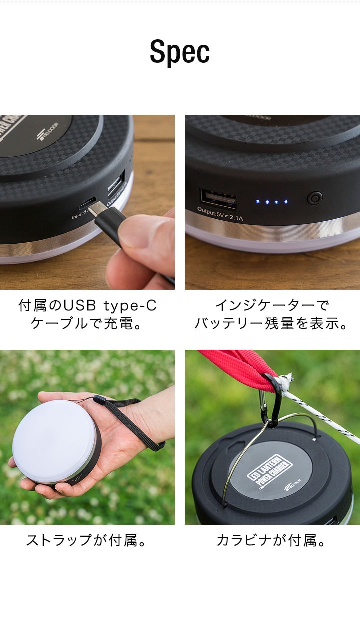| 付属品: USB type-Cケーブル、カラビナ、ストラップ |