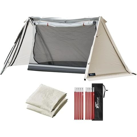 FIELDOOR パップテント 320 (ライトベージュ/B2:Bセット&テントポール) 軽量 一人用 ソロテント 三角テント 軍幕 テント A型テント 二又ポール採用 ドームテント フルクローズテント ソロキャンプ アウトドア UVカット フライシート メッシュ インナーテント 送料無料