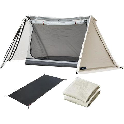 FIELDOOR パップテント 320 (ライトベージュ/B3:Bセット&グランドシート) 軽量 一人用 ソロテント 三角テント 軍幕 テント A型テント 二又ポール採用 ドームテント フルクローズテント ソロキャンプ アウトドア UVカット フライシート メッシュ インナーテント 送料無料