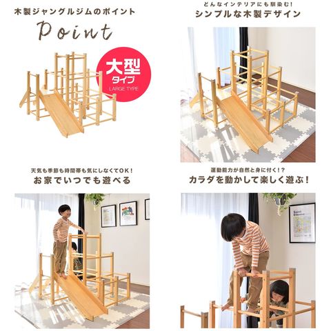 外で遊べない雨の日も家で大はしゃぎ♪遊び盛りのお子様がいる家庭にぴったりな滑り台付きのジャングルジムです。木製なのでリビングにも馴染みます。