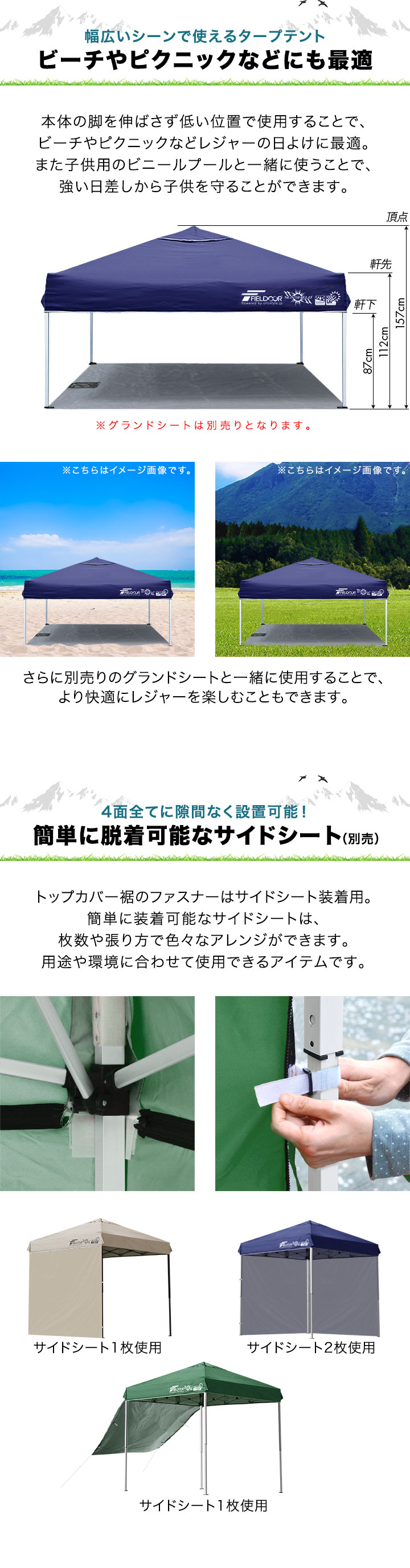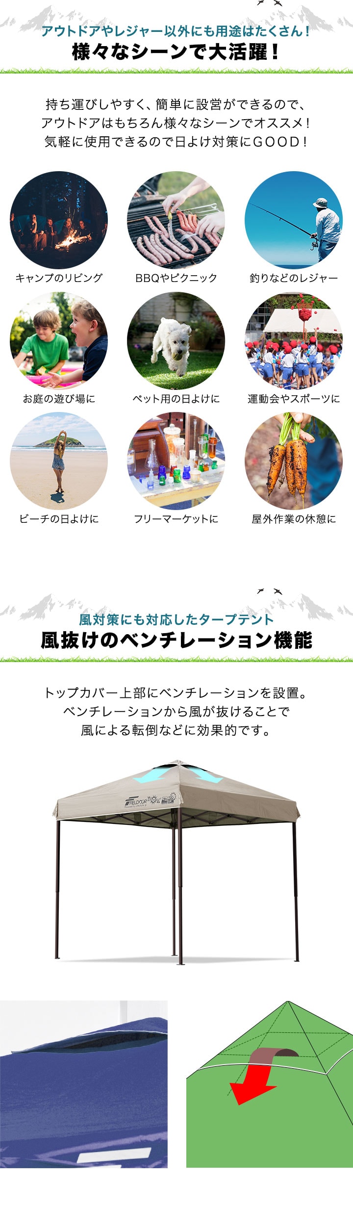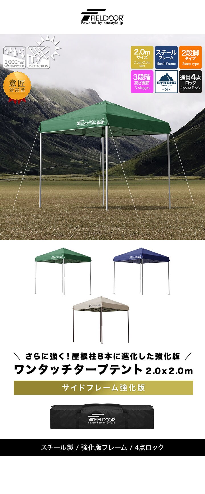 FIELDOOR ワンタッチタープテント 2m (標準:グリーン/スチール/強化版サイドフレーム/4点脚ロック/タープ本体のみ) テント タープ ワンタッチ ワンタッチテント ワンタッチタープ UV加工 撥水 ベンチレーション 収納バッグ付 日よけ キャンプ 送料無料