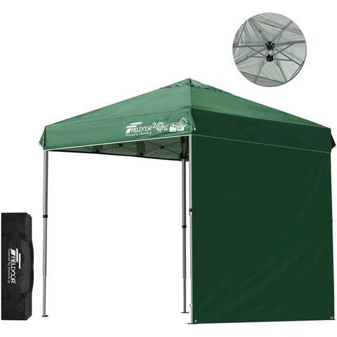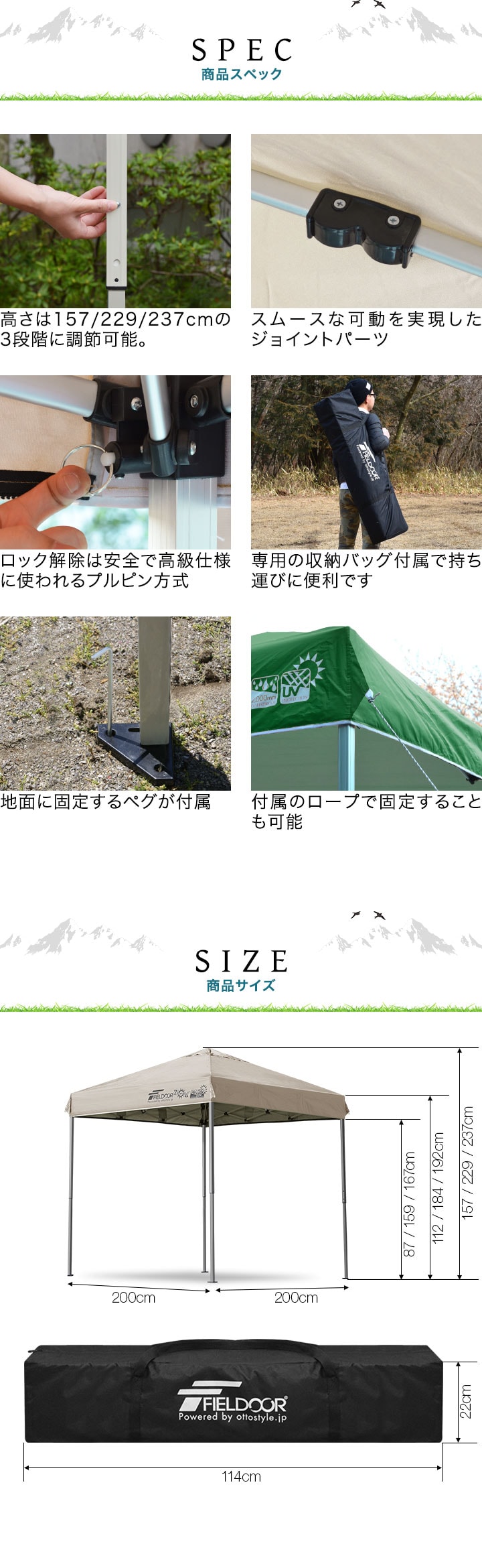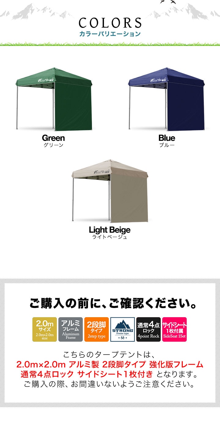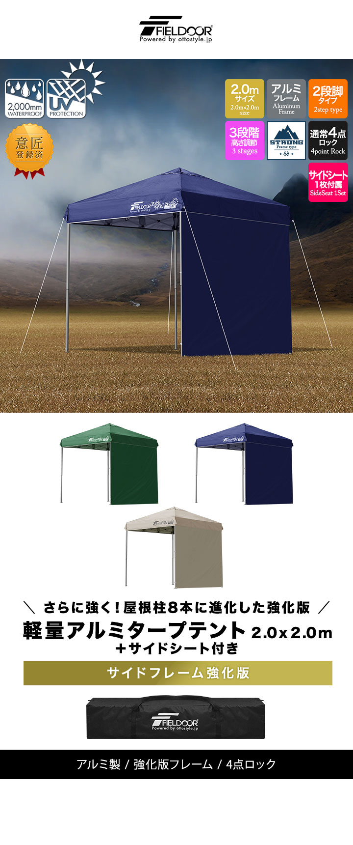 FIELDOOR ワンタッチタープテント 2m (標準:グリーン/アルミ/強化版サイドフレーム/4点脚ロック/タープ本体のみ/サイドシート1枚付) 軽量 テント タープ ワンタッチテント ワンタッチタープ UV加工 撥水 ベンチレーション 収納バッグ付 日よけ キャンプ 送料無料