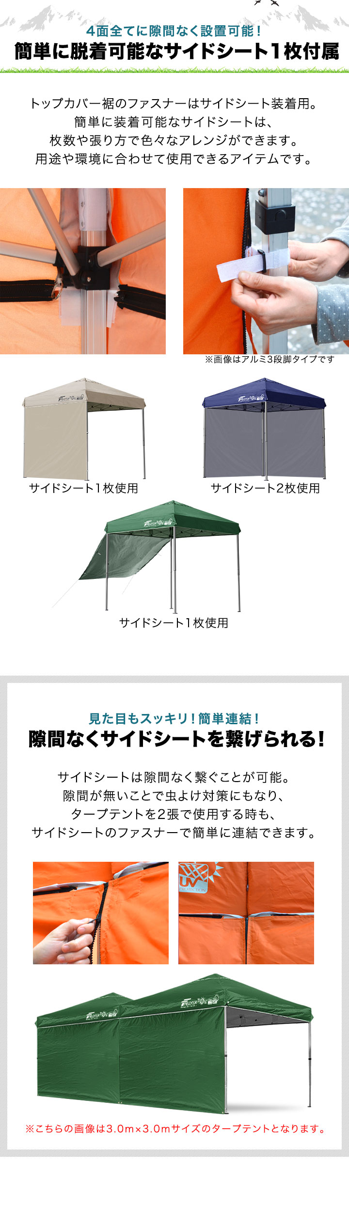 | 付属品: ・専用サイドシート(1枚) ・ロープ ・ペグ ・収納バッグ ・取扱説明書 |