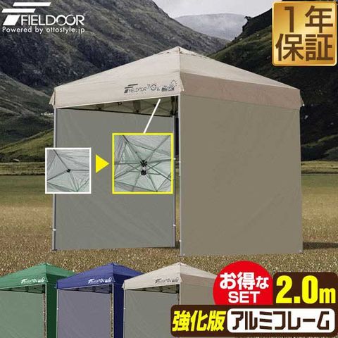 FIELDOOR ワンタッチタープテント 2m (標準:ブルー/アルミ/強化版サイドフレーム/4点脚ロック/タープ本体のみ/サイドシート2枚付) 軽量 テント タープ ワンタッチテント ワンタッチタープ UV加工 撥水 ベンチレーション 収納バッグ付 日よけ キャンプ 送料無料