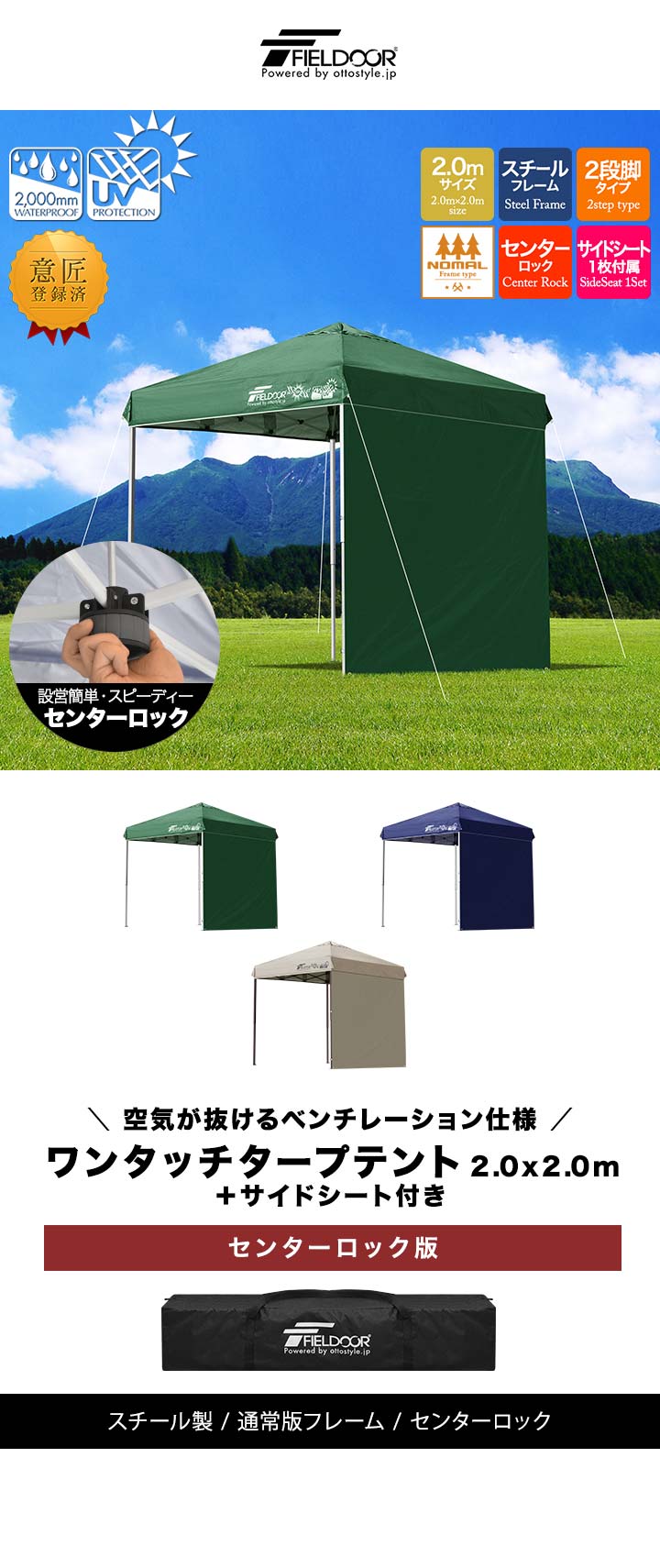 FIELDOOR ワンタッチタープテント 2m (標準:ブルー/スチール/センターロック/タープ本体のみ/サイドシート1枚付) テント タープ ワンタッチ ワンタッチテント ワンタッチタープ UV加工 撥水 ベンチレーション 収納バッグ付 日よけ キャンプ バーベキュー 送料無料