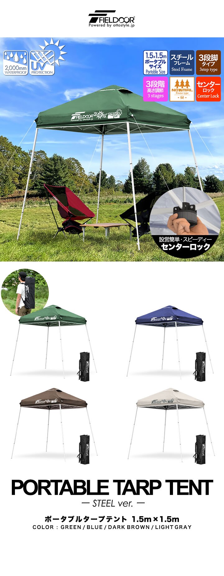 FIELDOOR ポータブルタープ 1.5m×1.5m (標準:ブルー/スチール/センターロック/タープ本体のみ) タープ テント 頑丈 スチール 150cm コンパクト 収納 小型 持ち運び 簡単 設営 ワンタッチタープ ワンタッチテント UV加工 撥水 アウトドア キャンプ 送料無料