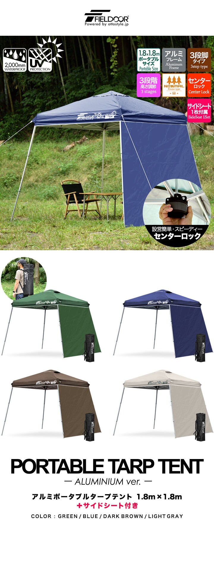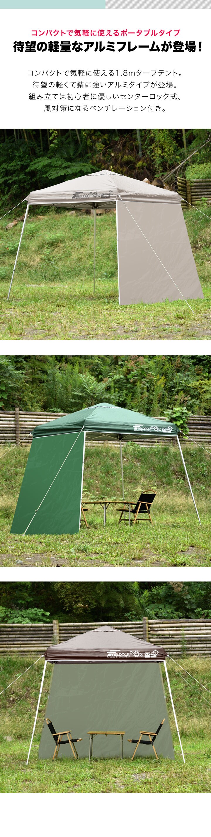 FIELDOOR ポータブルタープ 1.8m×1.8m (標準:ダークブラウン/アルミ/センターロック/サイドシート1枚付き) タープ テント 頑丈 アルミ 180cm コンパクト 収納 小型 持ち運び 簡単 設営 ワンタッチタープ ワンタッチテント UV加工 撥水 アウトドア キャンプ 送料無料