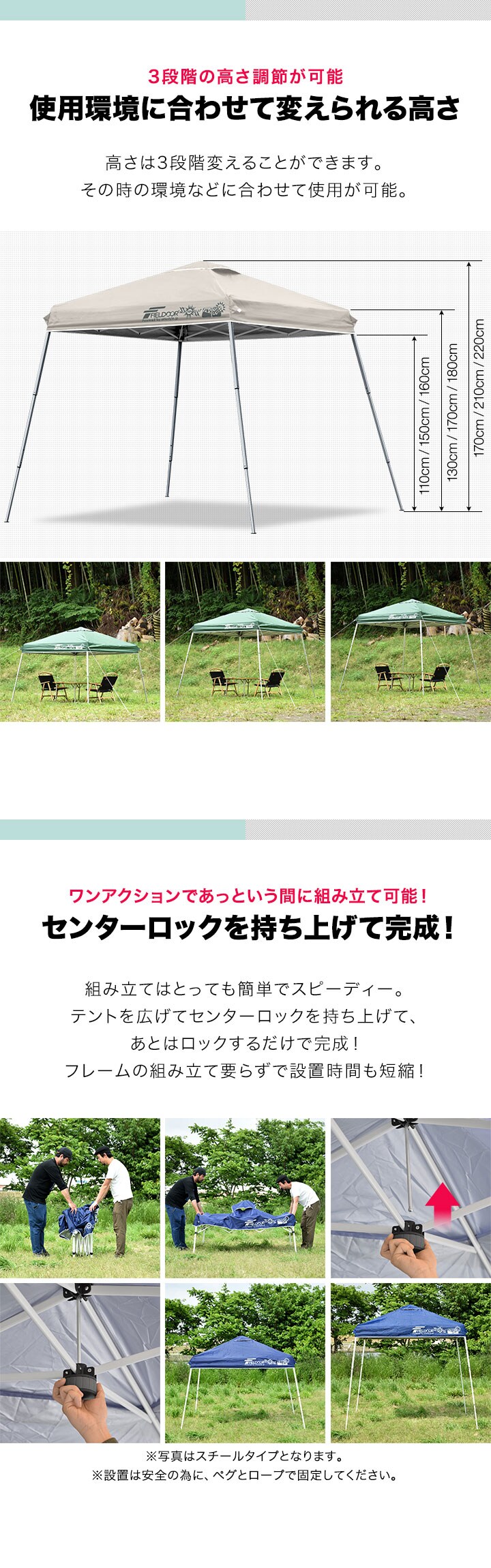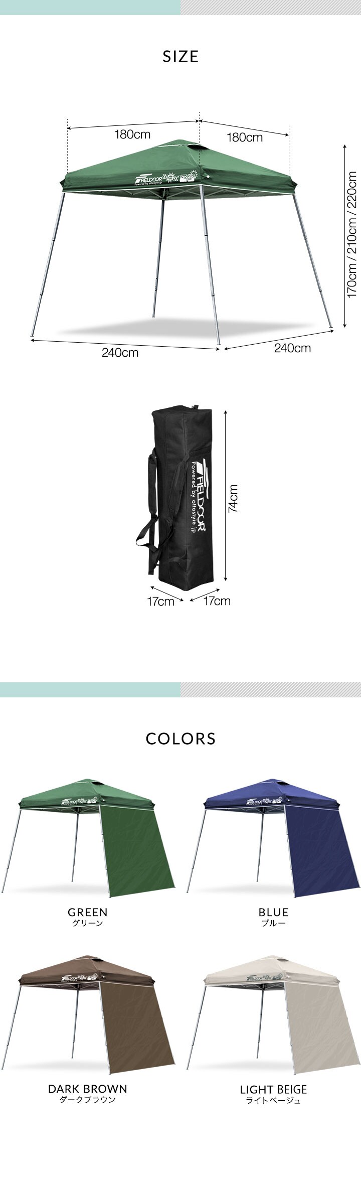 | サイズ: 組立時 : (約)2.4m×2.4m×2.2m ※最大寸法 収納時 : (約)17cm×17cm×74cm |