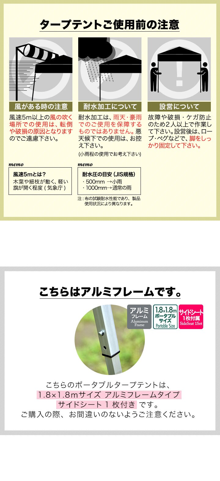 | 付属品: ・専用サイドシート(1枚) ・ロープ ・ペグ ・専用収納ケース ・取扱説明書(日本語) |