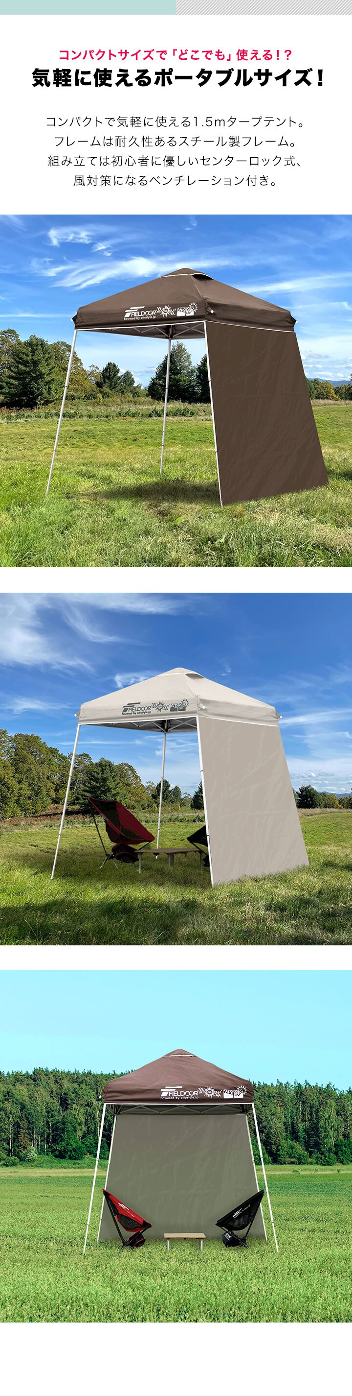FIELDOOR ポータブルタープ 1.5m×1.5m (標準:ライトベージュ/スチール/センターロック/サイドシート1枚付) タープ テント 頑丈 スチール 150cm コンパクト 収納 小型 持ち運び 簡単 設営 ワンタッチタープ ワンタッチテント UV加工 撥水 アウトドア キャンプ 送料無料